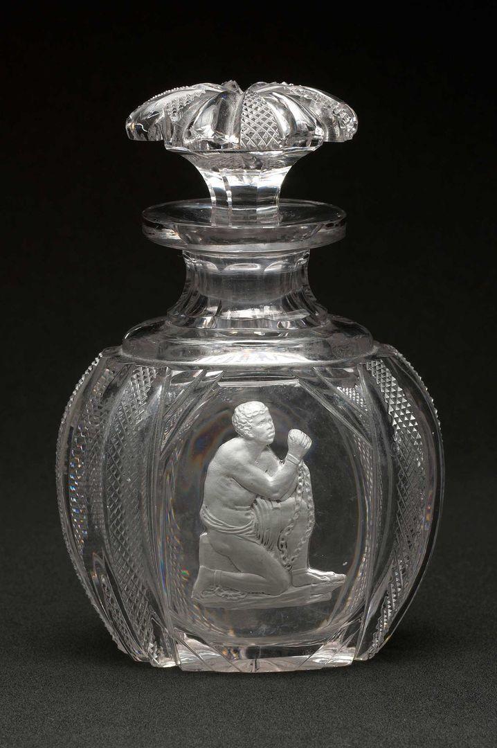 Apsley Pellatt. Cologne Bottle with Encrusted Antislavery Image, ca. 1830. Blown and cut glass with encased sulphide, H. 6 in. (15.2 cm), W. 4 in. (10.2 cm), D. 2 3/4 in. (7 cm). Minneapolis Institute of Art, Gift of the Decorative Arts Council (2001.40a, b)