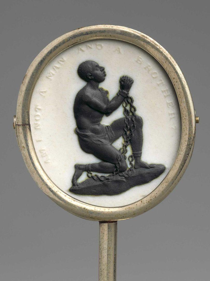 Josiah Wedgwood (British, 1730–1795). Antislavery Medallion, ca. 1787. Jasperware, Overall (confirmed): 1 1/4 x 1 in. (3 x 2.7 cm); Overall (as mounted, confirmed): 2 1/4 x 1 1/8 in. (6 x 3 cm). The Metropolitan Museum of Art, New York, Gift of Frederick Rathbone, 1908 (08.242)