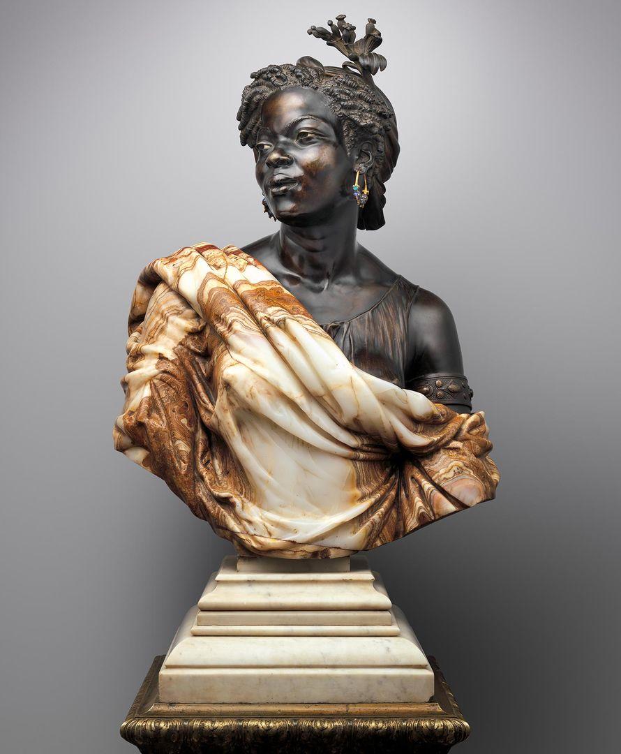 Cordier’s sculpture, in bronze and Algerian marble, was widely celebrated for its technical intricacies and detailed representation— including the figure’s skin color, facial features, and hair texture. She is draped in colorful marble and luxurious jewelry with gemstones. She wears a headpiece and a flower in her hair.