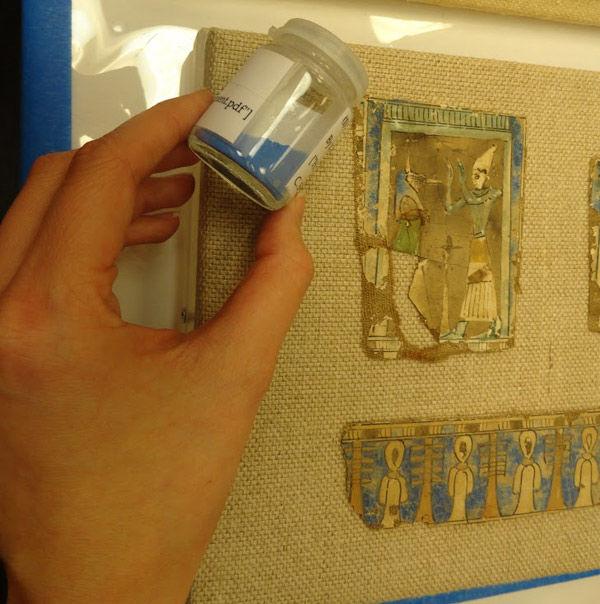 Carrie Roberts, a former fellow of the Museum, shows us samples of Egyptian blue in order to compare our digital recreation with a surviving pigment. Image courtesy of the authors