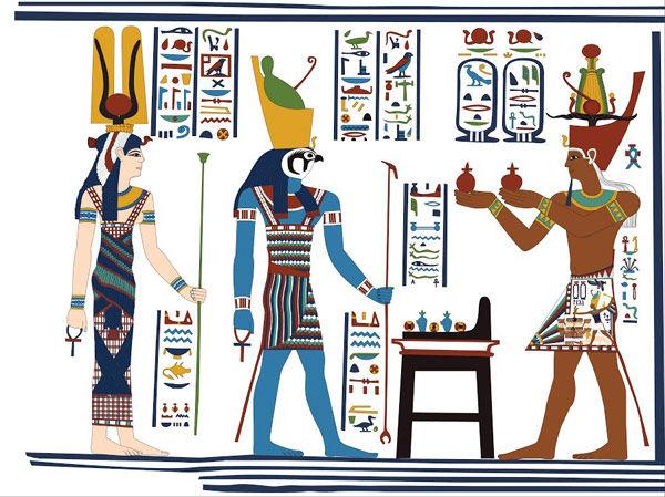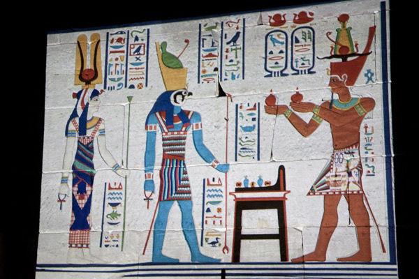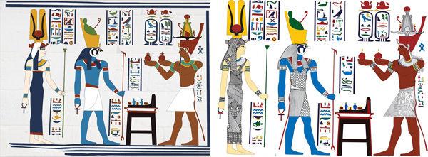 In the scene on the Temple, Emperor Caeser Augustus, depicted as Pharaoh, arrives and offers wine to the deities Hathor and Horus, so we created an animated version of this. In the original scene, the glyphs represent the dialogue between the emperor and the deities, so we highlighted the glyphs and made them larger. We also used the animation to explain how seemingly flat figures in Egyptian art actually represent 3D scenes, like in the case shown below, where Hathor seems to be behind Horus, but in reality they were side by side.