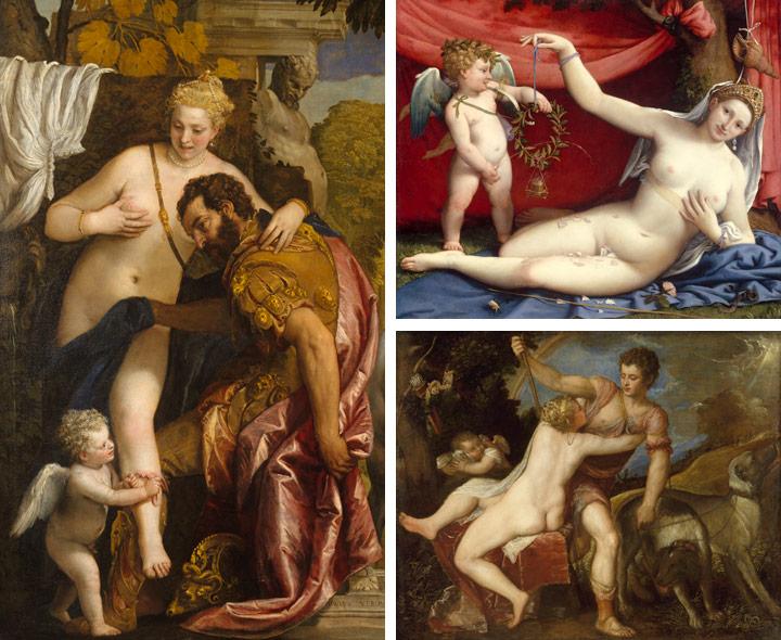 Clockwise from left: Paolo Veronese (Paolo Caliari) (Italian, 1528–1588). Mars and Venus United by Love (detail), 1570s. Oil on canvas, 81 x 63 3/8 in. (205.7 x 161 cm). The Metropolitan Museum of Art, New York, John Stewart Kennedy Fund, 1910 (10.189). Lorenzo Lotto (Italian, 1480–1556). Venus and Cupid. Oil on canvas, 36 3/8 x 43 7/8 in. (92.4 x 111.4 cm). The Metropolitan Museum of Art, New York, Purchase, Mrs. Charles Wrightsman Gift, in honor of Marietta Tree, 1986 (1986.138). Titian (Tiziano Vecellio) (Italian, ca. 1585/90–1576). Venus and Adonis. Oil on canvas, 42 x 52 1/2 in. (106.7 x 133.4 cm). The Metropolitan Museum of Art, New York, The Jules Bache Collection, 1949 (49.7.16)