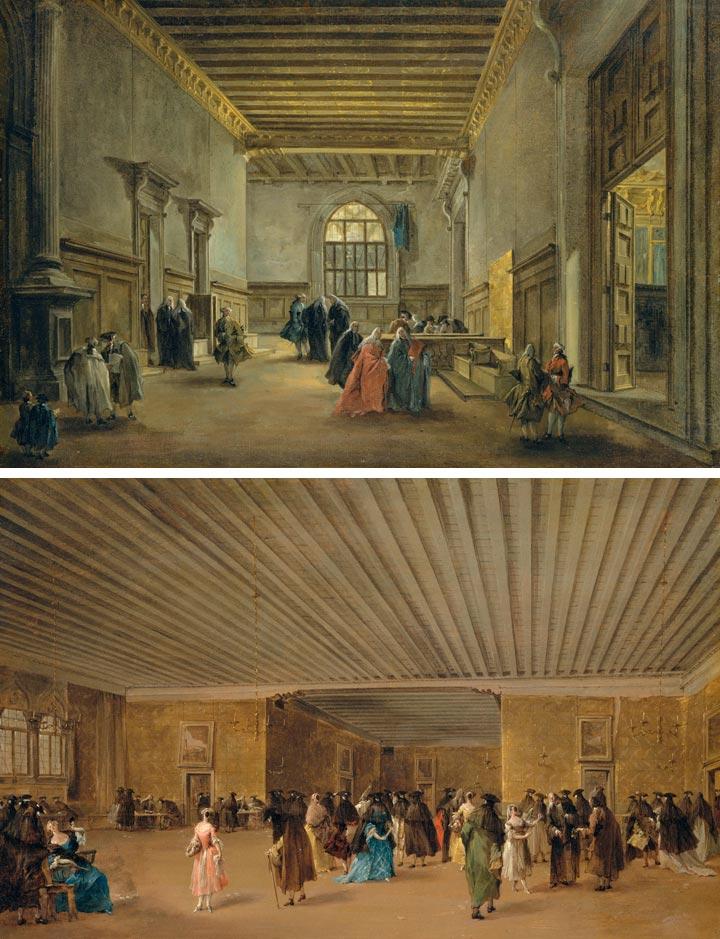 Top: Francesco Guardi (Italian, 1712–1793). The Antechamber of the Sala del Maggior Consiglio, ca. 1765–68. Oil on canvas, 13 3/8 x 20 in. (34 x 50.8 cm). The Metropolitan Museum of Art, New York, Bequest of Lore Heinemann, in memory of her husband, Dr. Rudolf J. Heinemann, 1996 (1997.117.4). Bottom: Francesco Guardi (Italian, 1712–1793). The Ridotto Pubblico at Palazzo Dandolo, ca. 1765–68. Oil on canvas, 13 3/8 x 20 in. (34 x 50.8 cm). The Metropolitan Museum of Art, New York, Bequest of Lore Heinemann, in memory of her husband, Dr. Rudolf J. Heinemann, 1996 (1997.117.5)