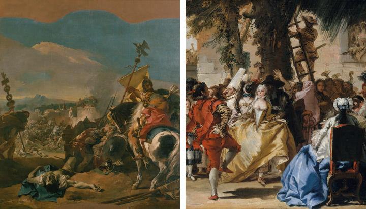 Left: Giovanni Battista Tiepolo (Italian, 1696–1770). The Capture of Carthage, 1725–29. Oil on canvas, 162 x 148 3/8 in. (411.5 x 376.9 cm). The Metropolitan Museum of Art, New York, Rogers Fund, 1965 (65.183.2). Right: Giovanni Domenico Tiepolo (Italian, 1696–1770). A Dance in the Country (detail), ca. 1755. Oil on canvas, 29 3/4 x 47 1/4 in. (75.6 x 120 cm). The Metropolitan Museum of Art, New York, Gift of Mr. and Mrs. Charles Wrightsman, 1980 (1980.67)