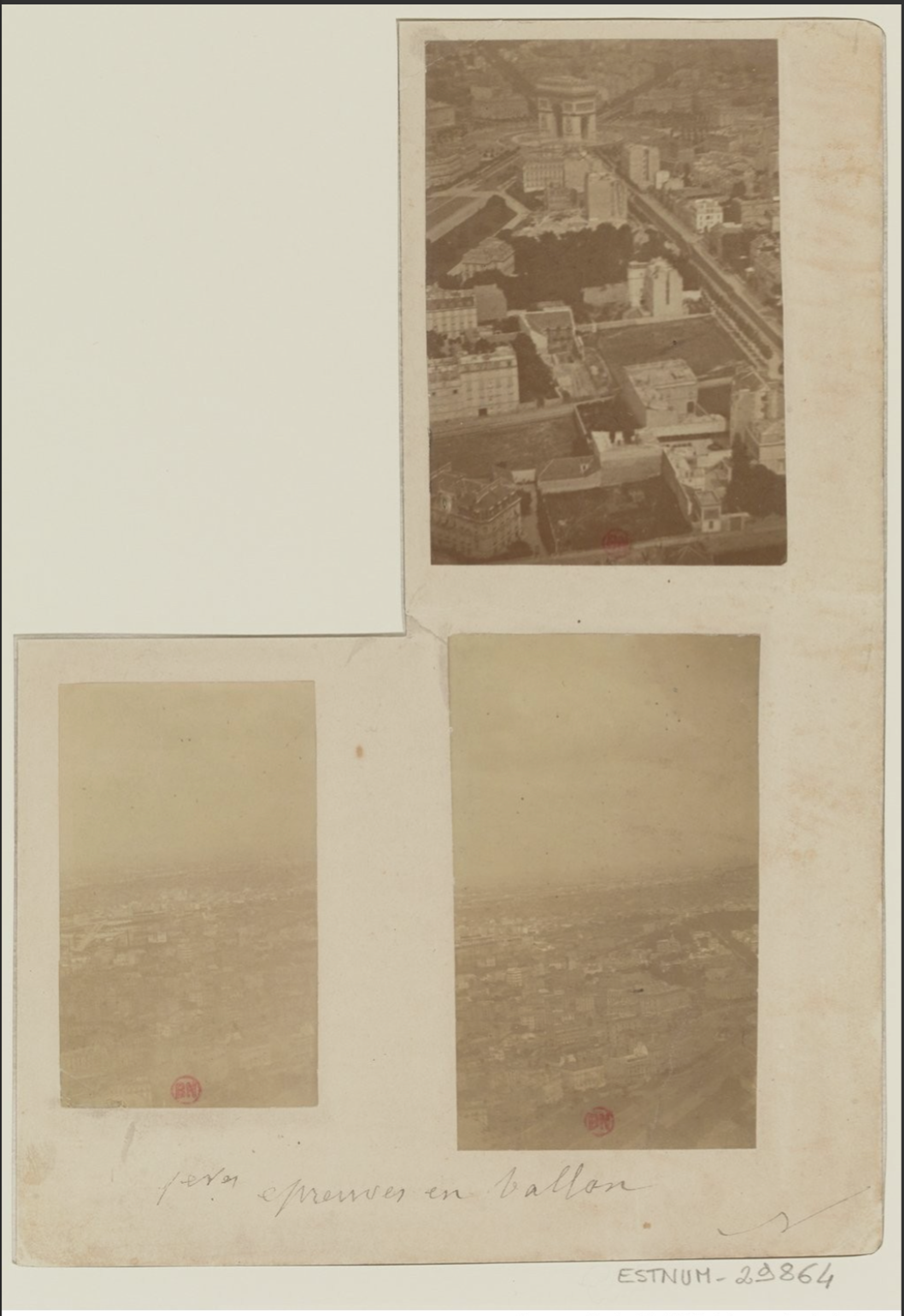 Image: Félix Nadar, 1ères [Premières] épreuves en ballon / trois vues aériennes de Paris, 1868. Photograph. Collection of the Département des Estampes et de la photographie, Bibliothèque national de France, Paris.