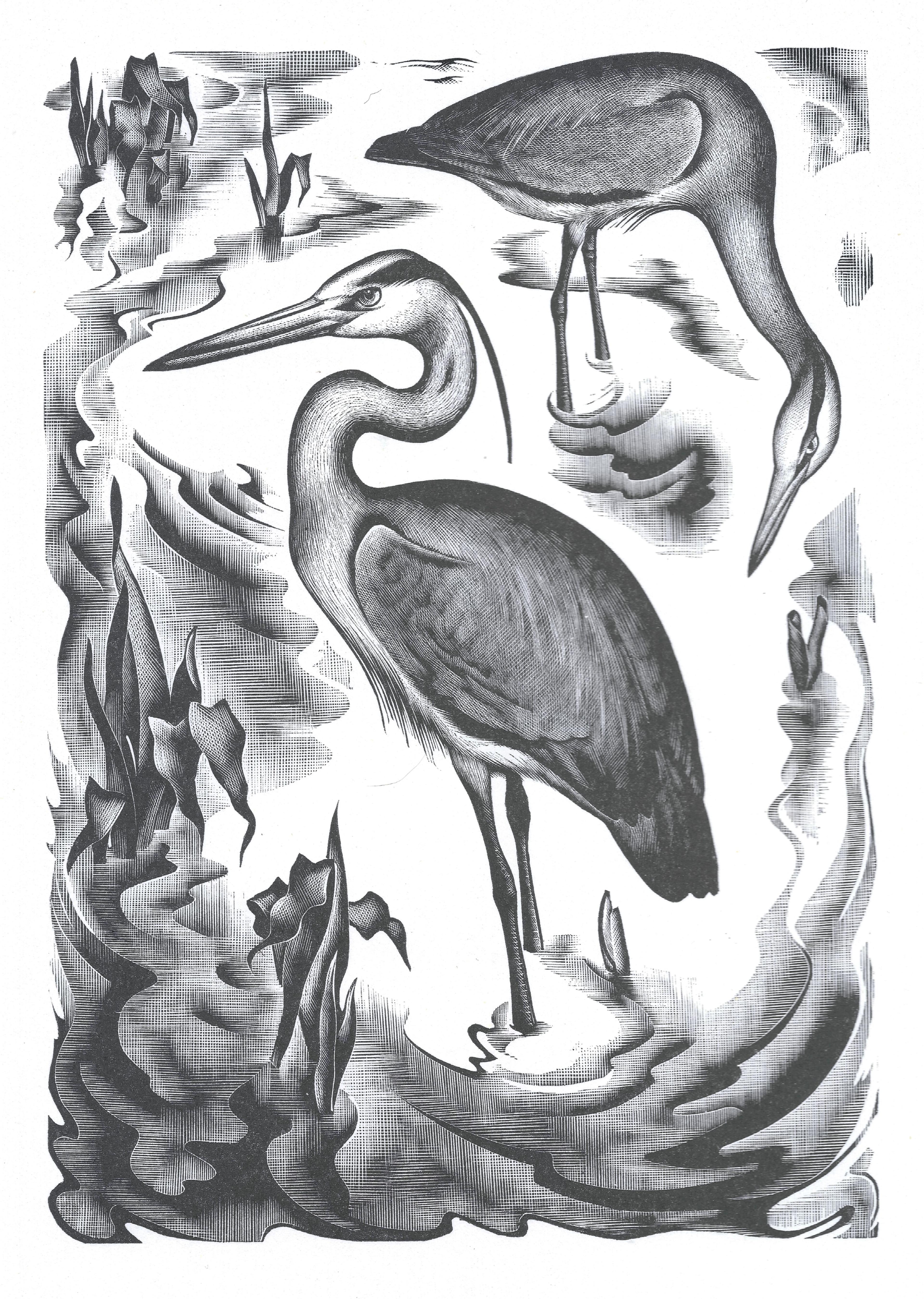 Image: Agnes Miller Parker, Herons, in Down the River by H. E. Bates (1937).