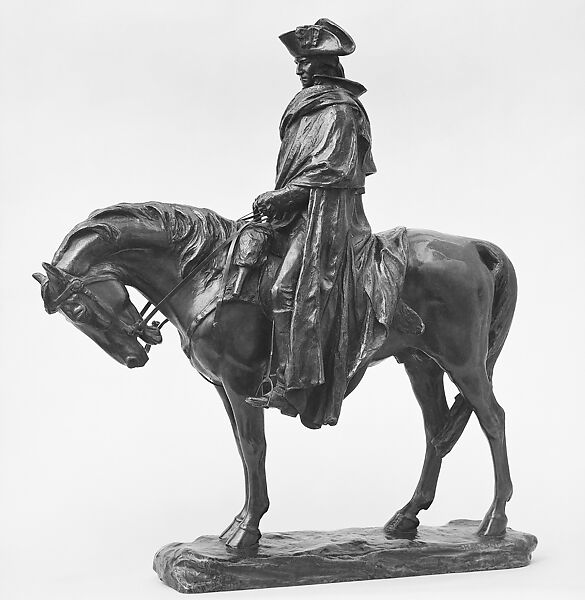 In “George Washington at Valley Forge” the somber commander-in-chief is depicted mounted on his horse, dressed in a Continental uniform, and enveloped in a heavy cloak during the bleak winter of 1777-78, when his troops were bivouacked at Valley Forge, Pennsylvania. The heroic-size sculpture on a granite base was unveiled at Brooklyn Plaza of the Williamsburg Bridge (now Continental Army Plaza) on September 29, 1906. The Metropolitan’s statuette is a replica of the maquette that was approved for the monument by the Art Commission of the City of New York in 1905.