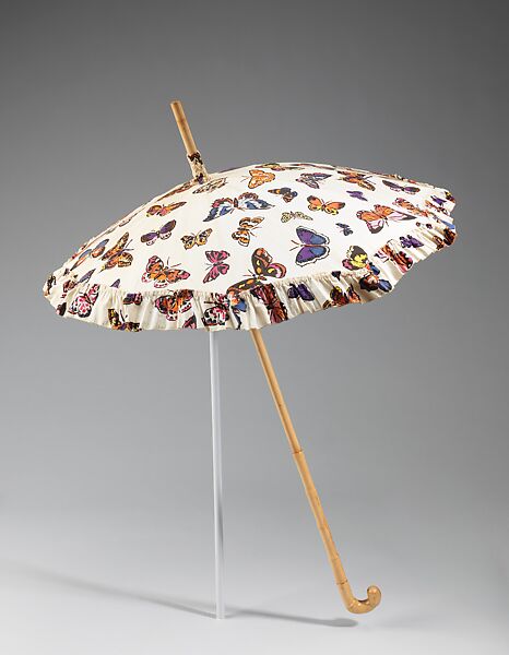 The butterfly was the Surrealist symbol for change, particularly the change from ugly to beautiful. As the unlovely caterpillar changes into the brilliant colorful butterfly, so Schiaparelli's designs could transform the ordinary into the extraordinary. Many of her clients were women who did not possess the accepted standard of beauty, but rather a more striking sort of chic, such as the Duchess of Windsor and Millicent Rogers, who owned this parasol. This design features a lively butterfly print on a quirky asymmetric canopy that expresses the wide array of types and colorations of butterflies, inspired by Surrealist artists such as Salvador Dalí, Max Ernst and Man Ray. Schiaparelli shared many Surrealist views with these artists and often used her designs as a means to express these views. For her summer 1937 collection, Schiaparelli featured the butterfly print on parasols, silk evening dresses (see 2009.300.1347a, b) and her new waltz-length evening dresses.
