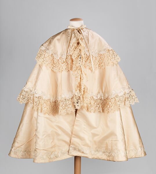 This is an extraordinarily grand infant's garment which was probably made for a special occasion in which the baby would have been presented, such as a baptism or family occasion. The cape is voluminous in size and is heavily padded for warmth. The double insulation indicates that the baby would have been taken outside wearing this, perhaps in a carriage.