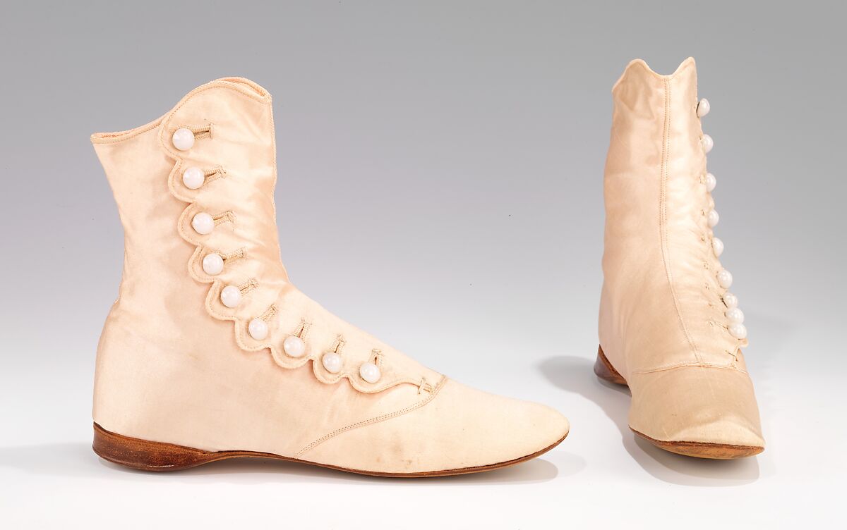 Rendered in an eye-catching glossy pale pink satin, this pair of girl's button boots is a classic of the era, with its scalloped fly, shaped top, and milk glass buttons. The high quality is evinced by the details, most notably the appealing and beautifully crafted heel, the precise stitching with tacks at stress points, and the matching pink leather facing.