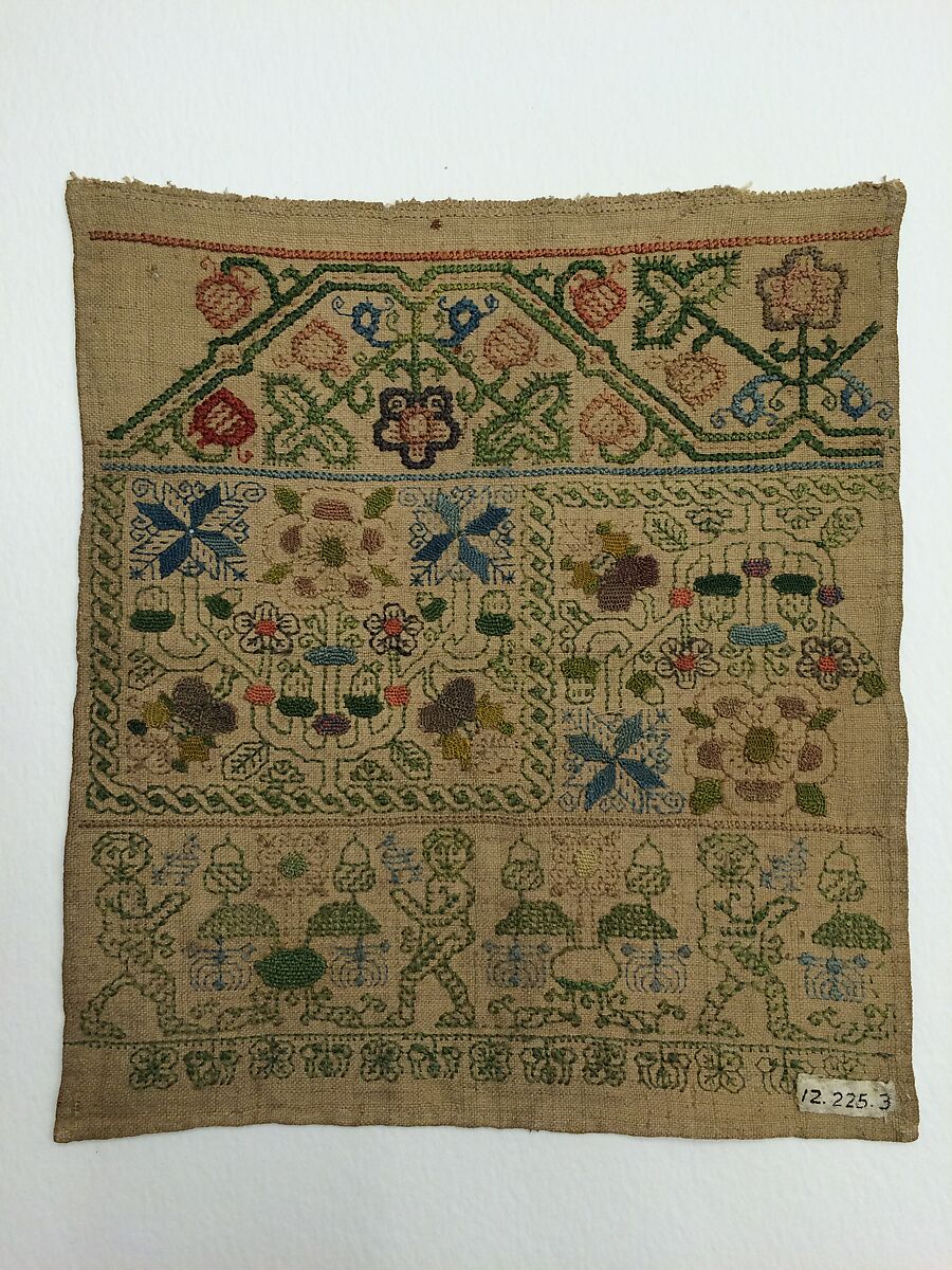 Band samplers are composed of horizontal rows ("bands") of embroidered patterns stitched along the woven linen foundation fabric. The shape of this band sampler is unusual, as it is square rather than rectangular, long to ensure that many bands can be stitched. Many of the patterns stitched onto band samplers can be traced to sixteenth-century pattern books, and often include depictions of fruit, flowers, and geometric patterns. This undated and unsigned sampler consists of three bands, the last of which includes "boxers," male figures who flank a floral motif and hold a "trophy," in this case a bird. The figure of the boxer is probably derived from the motif of a lover offering a flower to his beloved, which is also found in a number of sixteenth-century pattern books.