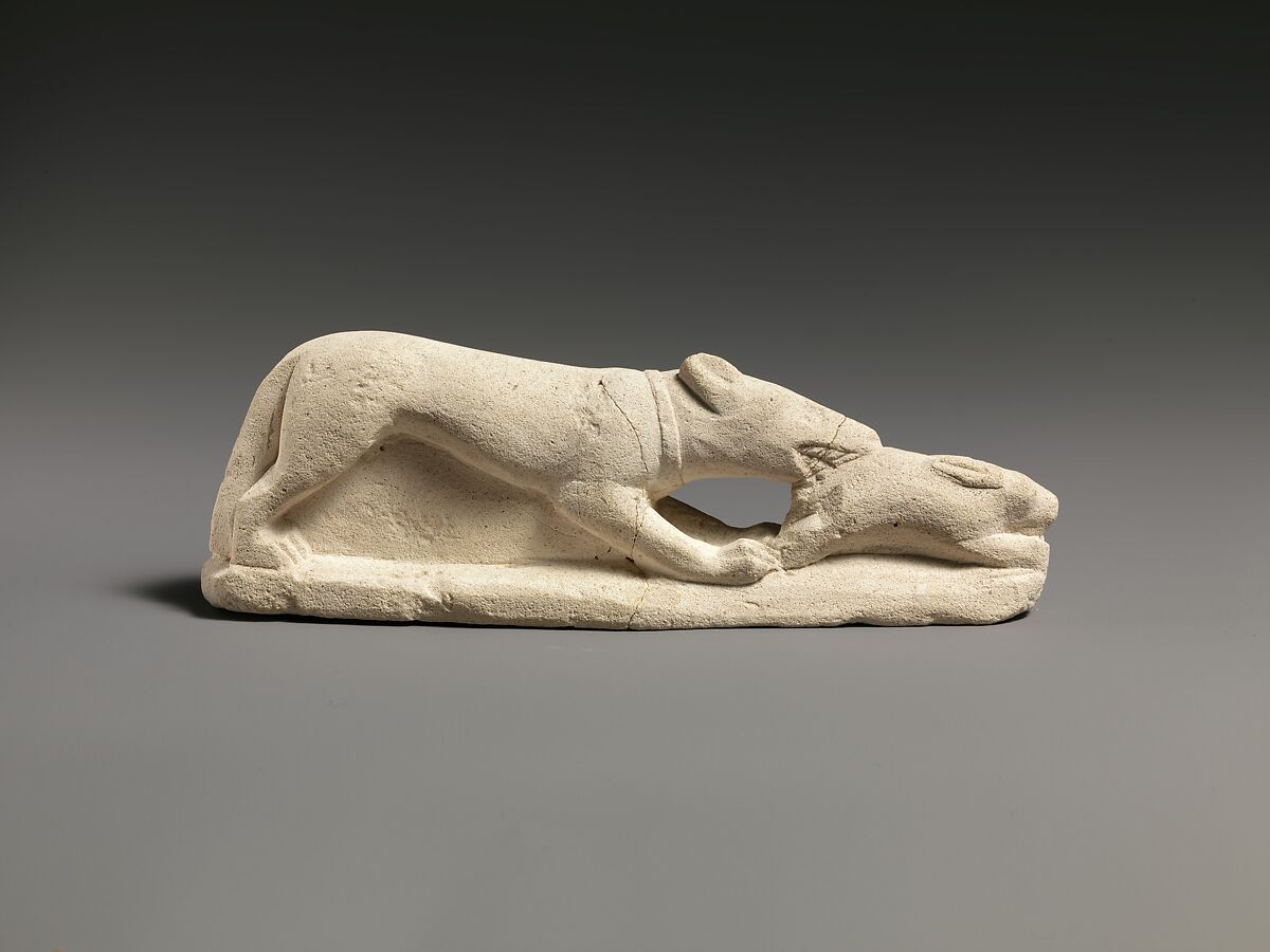 - Title: Limestone statuette of a coursing hound seizing a hare