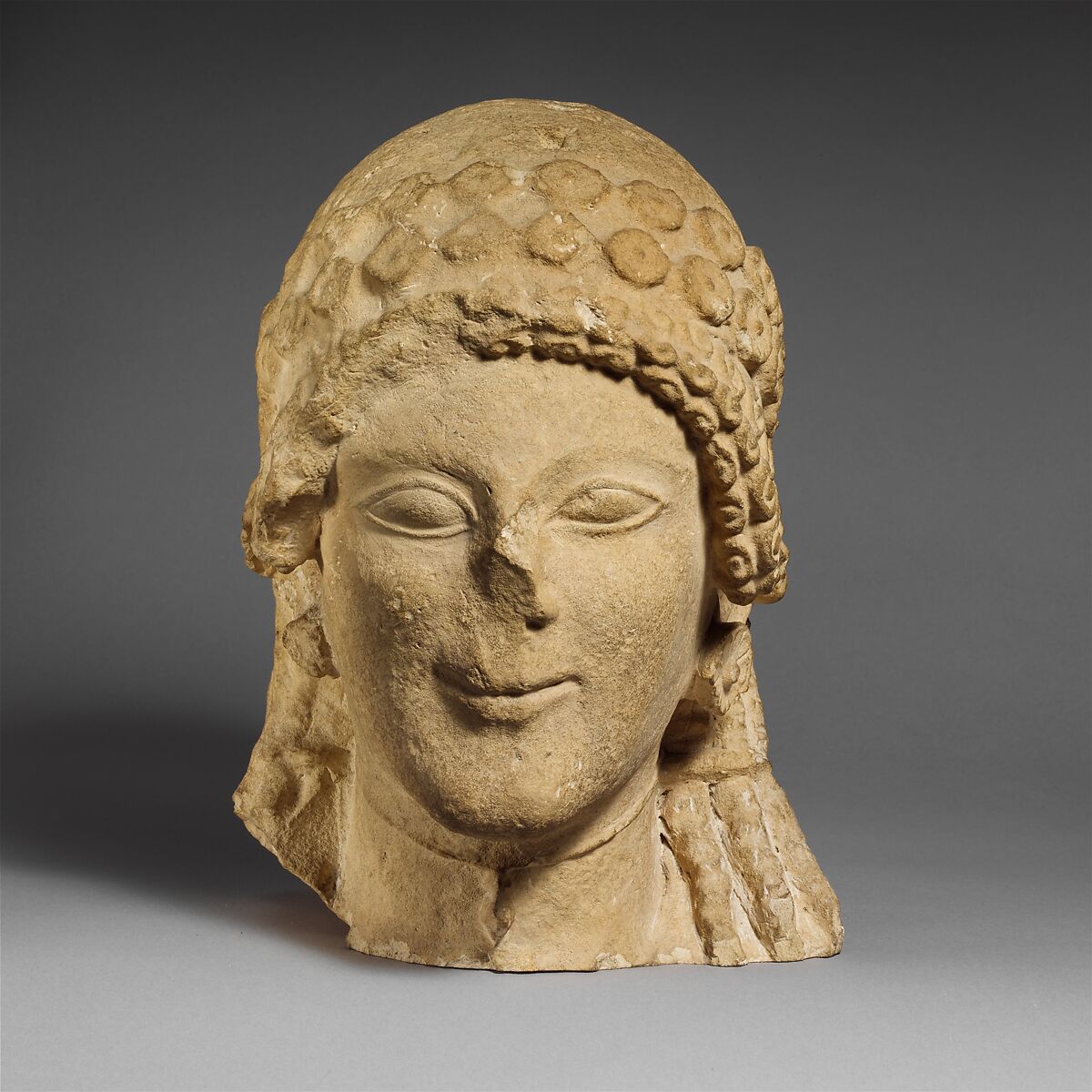 Female head with double frontlet of rosettes, necklace, and elaborate earrings.