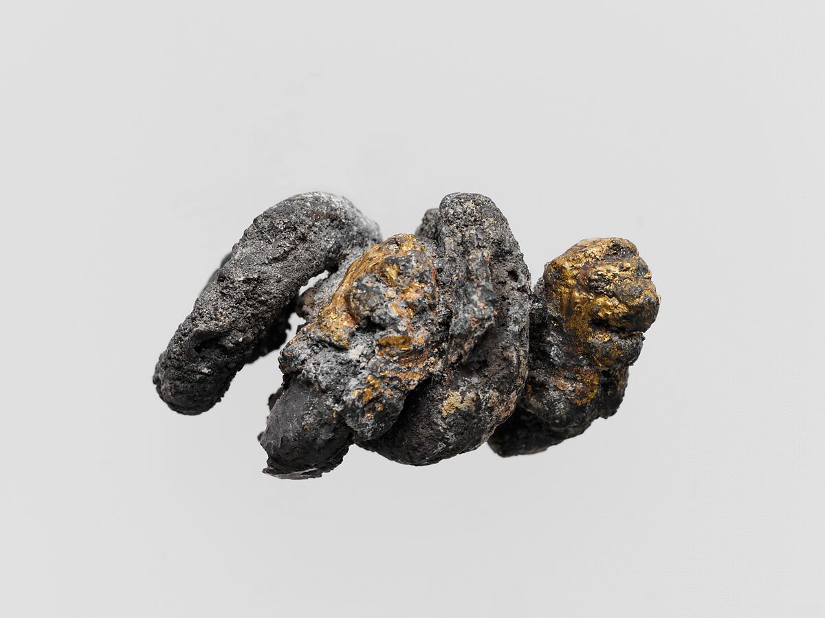 Two silver spirals have become fused into one object. The cause may have been the deterioration of the silver or, possibly, a fire from which the pieces were rescued before melting.