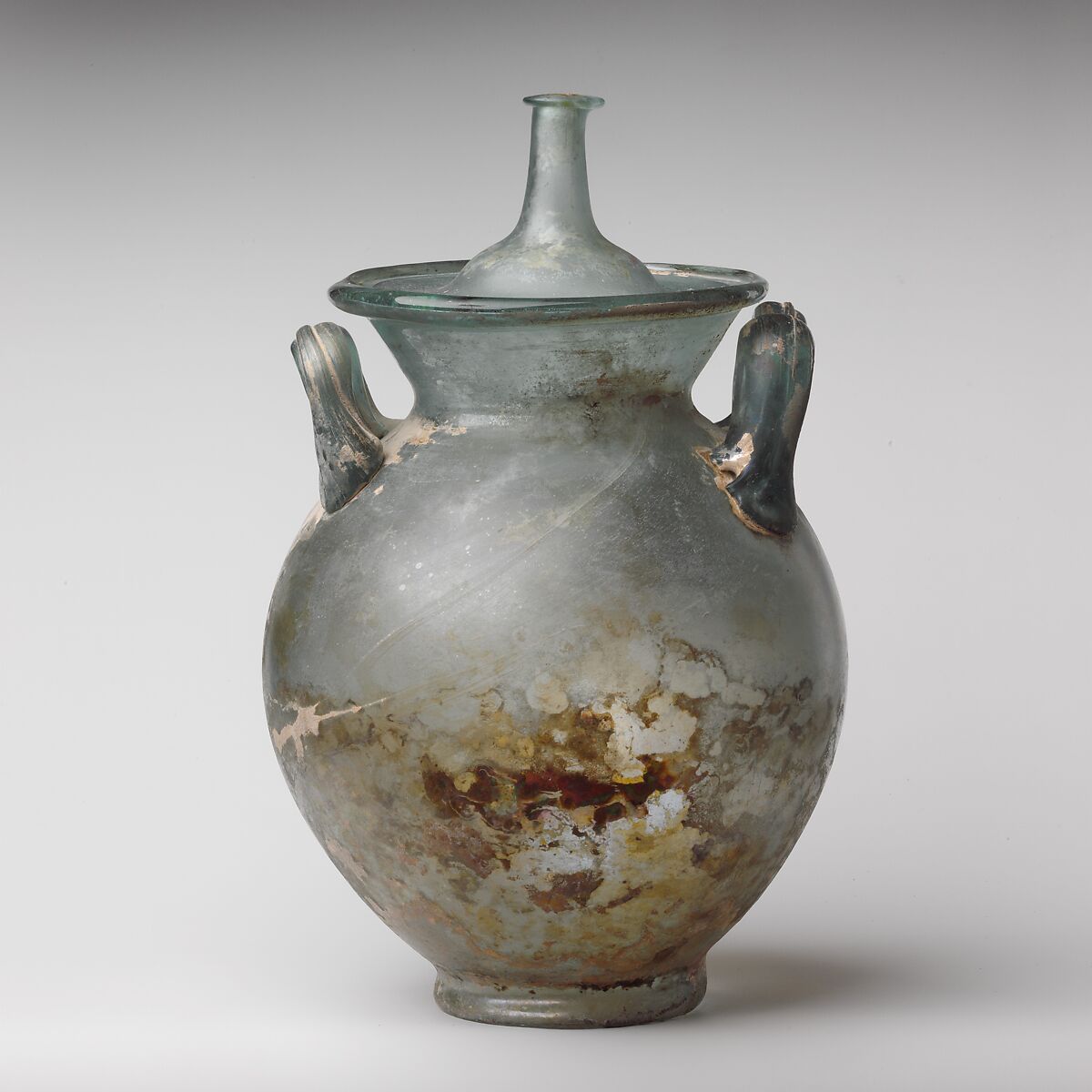Many glass urns are of a similar shape and size, with only minor variations in the forms of their handles and lids. When inverted, the lid on this example also could have served as a funnel. The shape may have been chosen deliberately so that offerings could be poured easily into the urn over the ashes of the deceased.