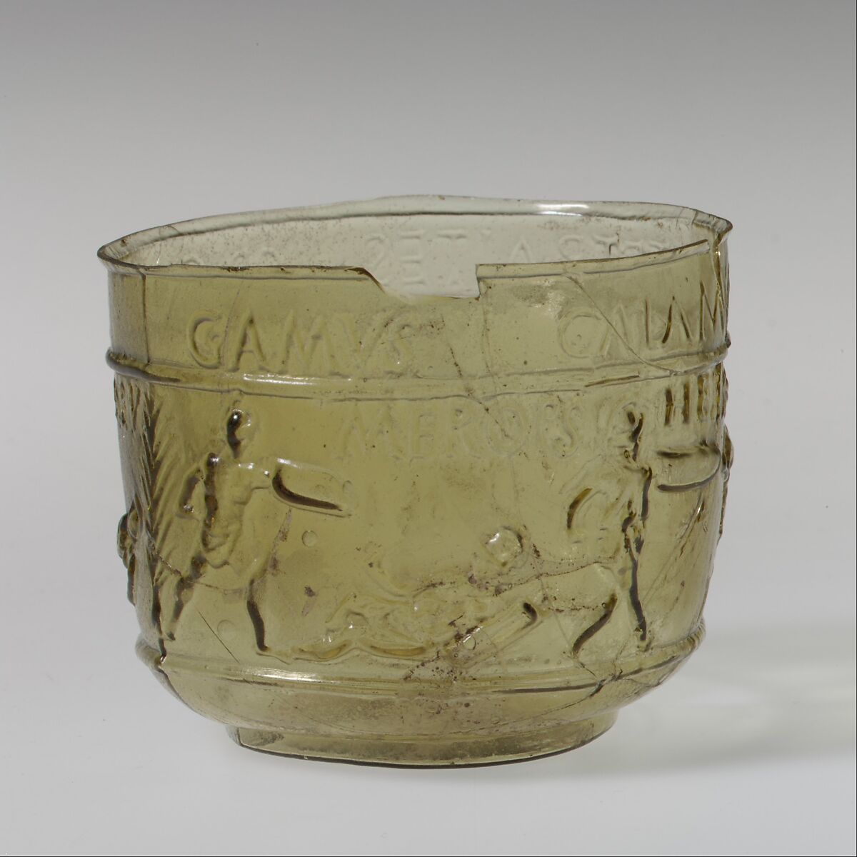 The scene around the cup depicts four pairs of gladiators fighting. Each man is identified by name in the Latin inscription above him. Some of the names match those of known gladiators who became famous in games held in Rome during the Julio-Claudian period, suggesting that such cups may have been made as souvenirs.