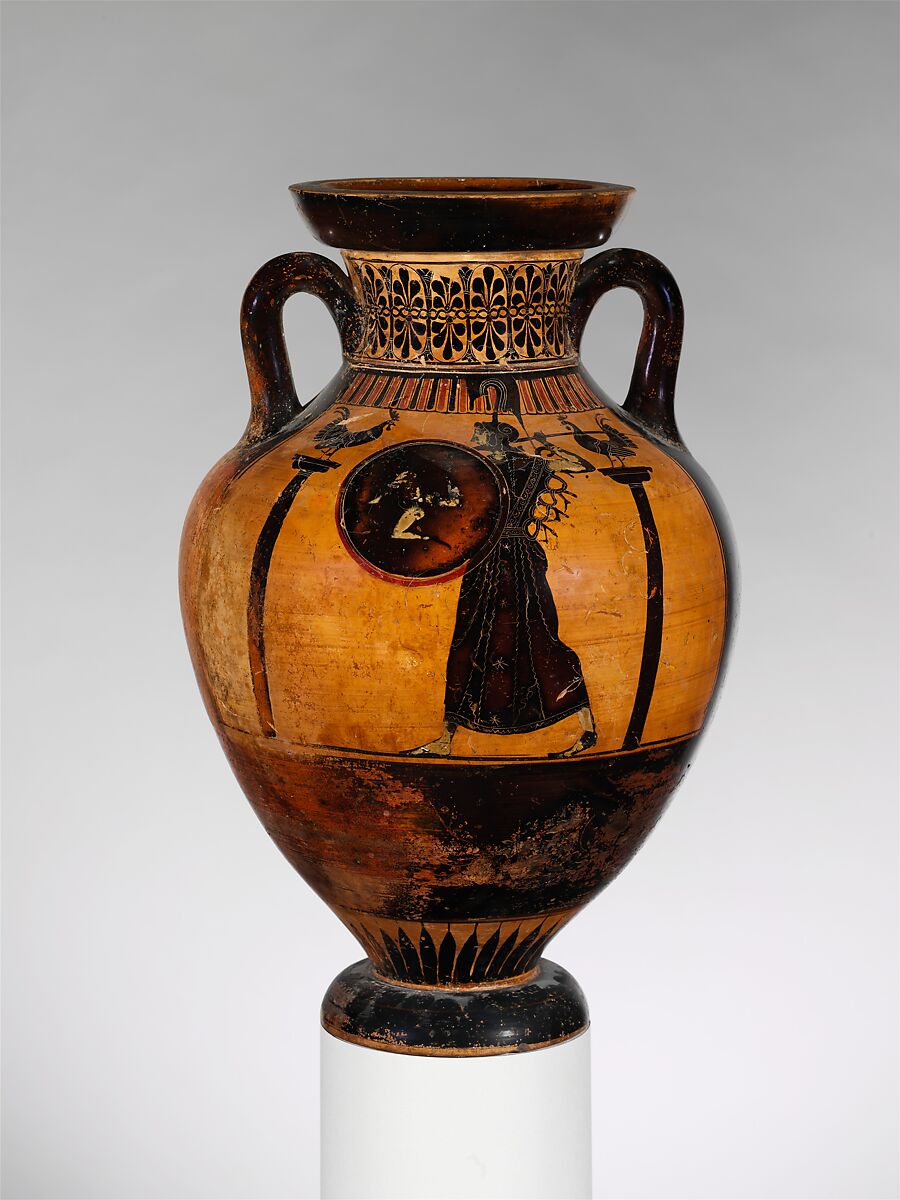 This amphora is different from the typical prize vase. It does not have the inscription identifying it as being from the games in Athens. Furthermore, the chariot on the reverse is at rest, not in competition.