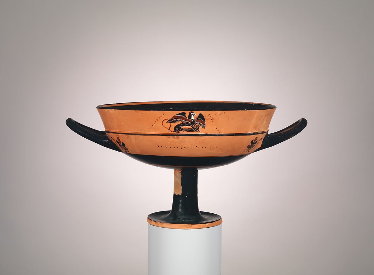 The larger cup demonstrates the basic decorative format of this popular shape. Here, the inscriptions are meaningless strings of letters framing the figural composition, but on other examples, they accurately record the artist's name, label characters depicted, or offer greetings. Little Master cups can be dated more precisely than most Etruscan vases and so are important indicators of the date of this tomb.