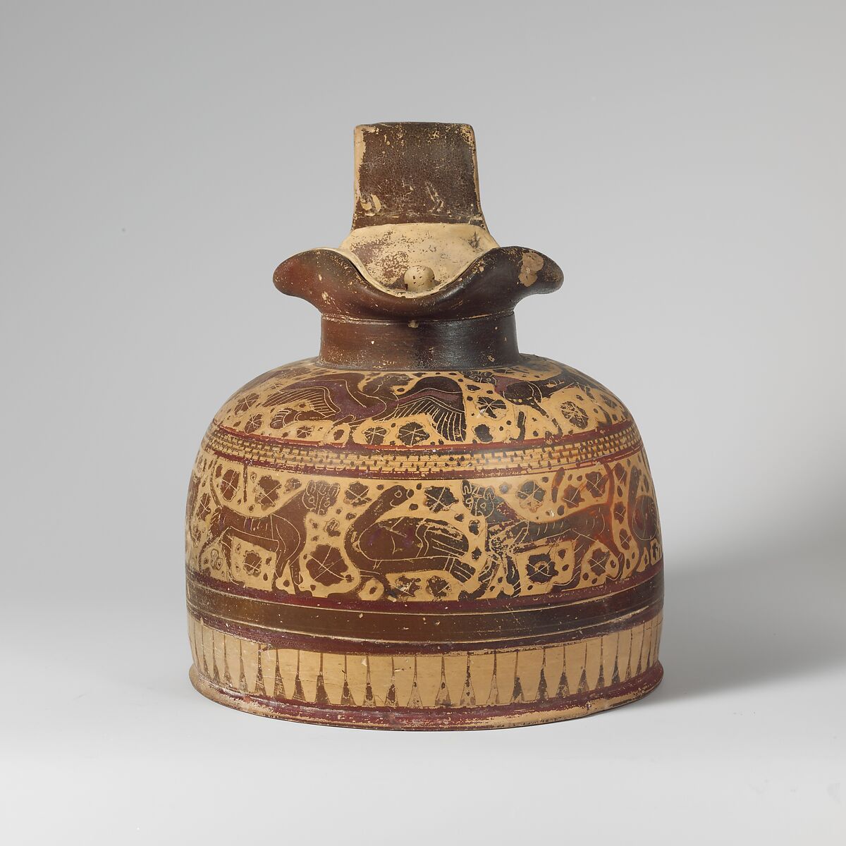 The broad-bottomed oinochoe, represented by this example, is a characteristic and very long-lived shape in Corinth. The presence of a lid distinguishes it from oinochoai of other Greek regions as well. Although the conventional name is retained, the shape was not necessary used to pour wine.