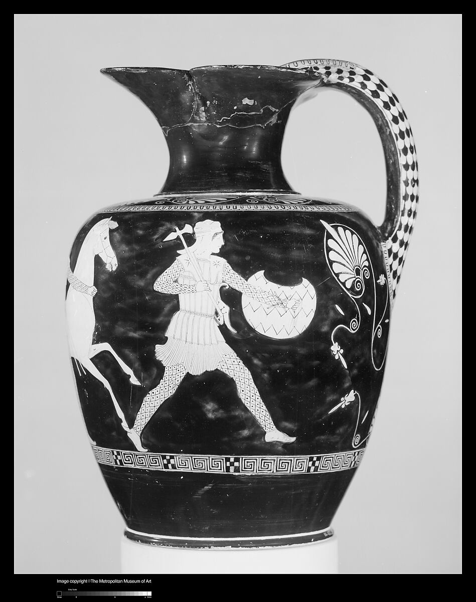 The Amazons on this splendid oinochoe are all named. Iole leads; she is equipped with a pelta (crescent-shaped shield), a bow and quiver, and a battle-ax. Antiope, facing forward, leads a horse and holds two spears. Penthesilea follows with a pelta, a bow and quiver, and spears. Antiope and Penthesilea were well known for their part in the lives of Theseus and Achilles, respectively. Throughout Greek art, in depictions of combat between Greeks and their enemies, the latter are always rendered as worthy antagonists. This perception applies particularly to Amazons.