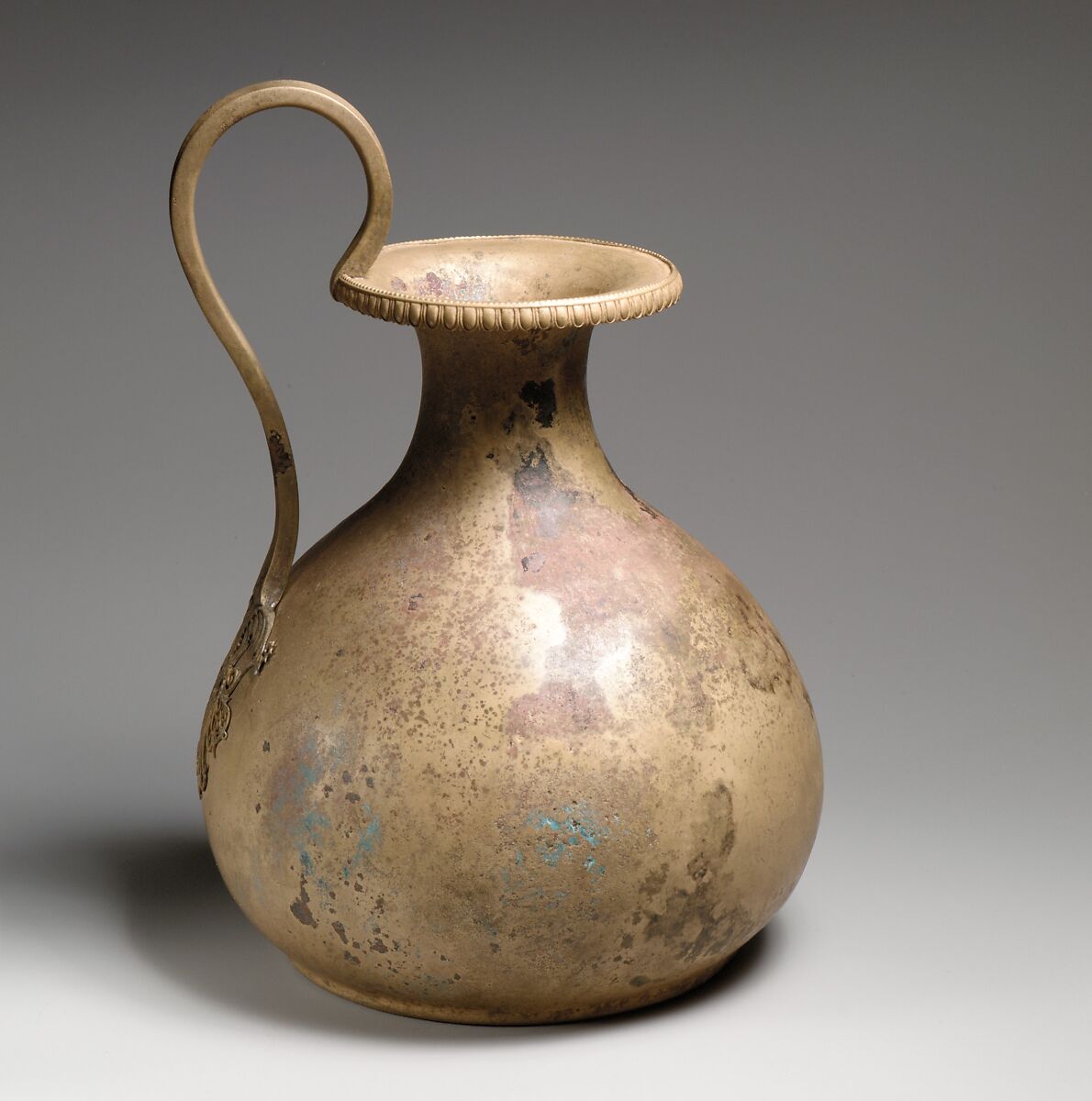 The high handle terminates in a beautiful relief of an inverted palmette and lotos rising from acanthus leaves. In the past the piece was severely cleaned of all archaeological corrosion products. It has recently been cosmetically toned with removable pigments.