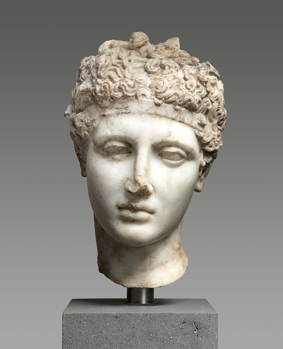 This head of a youth wearing a fillet (band) must have belonged to the statue of a victorious athlete. He probably rested one arm lightly on his head; the remains of a rectangular support can still be seen among his curls. Roman copies often conformed to contemporary taste, and the contrast between polished flesh and deeply drilled hair on this head would have held special appeal for clients in the second century A.D.