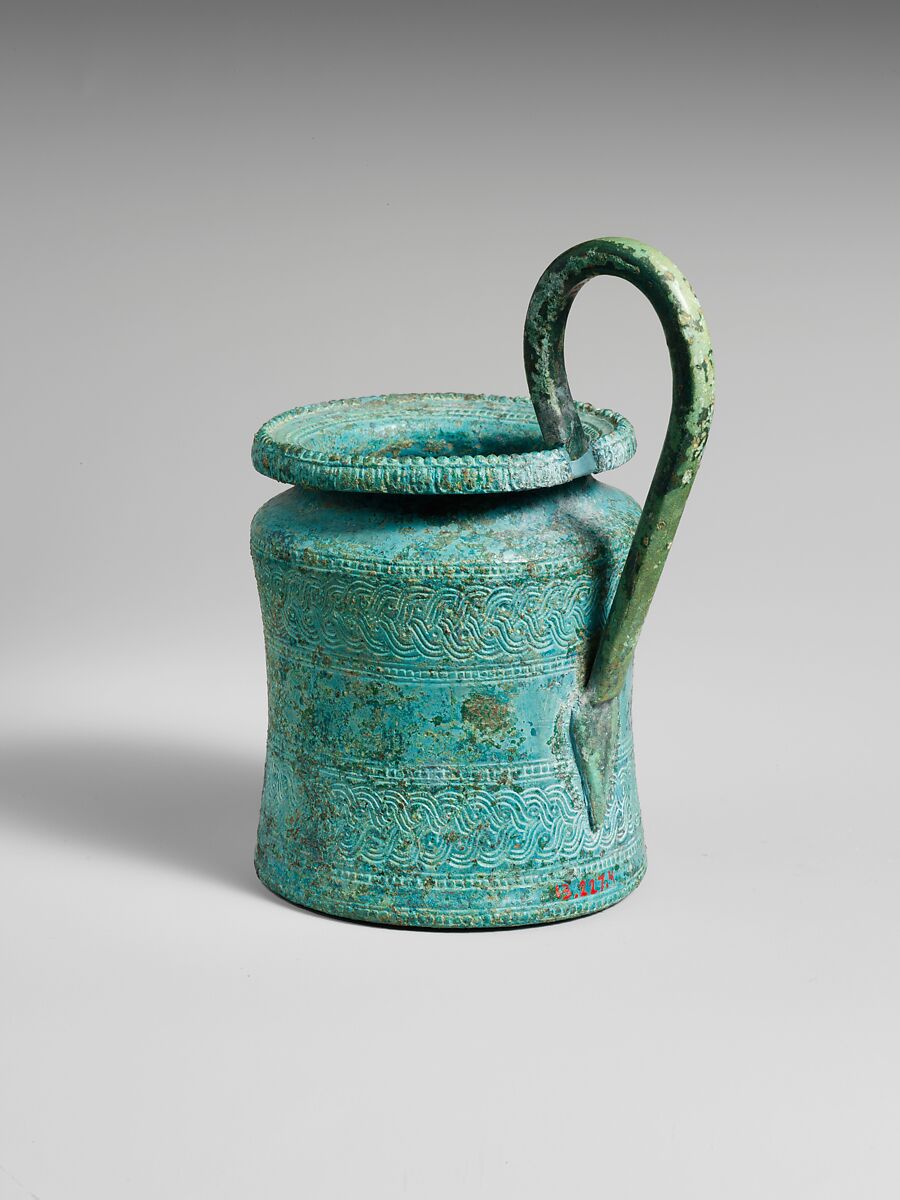 This is a very fine example of a Sant'Anatolia-type kyathos, a popular shape made in both bronze and terracotta. Several others of the type were found in the tomb-group from Civita Castellana displayed in a nearby case.