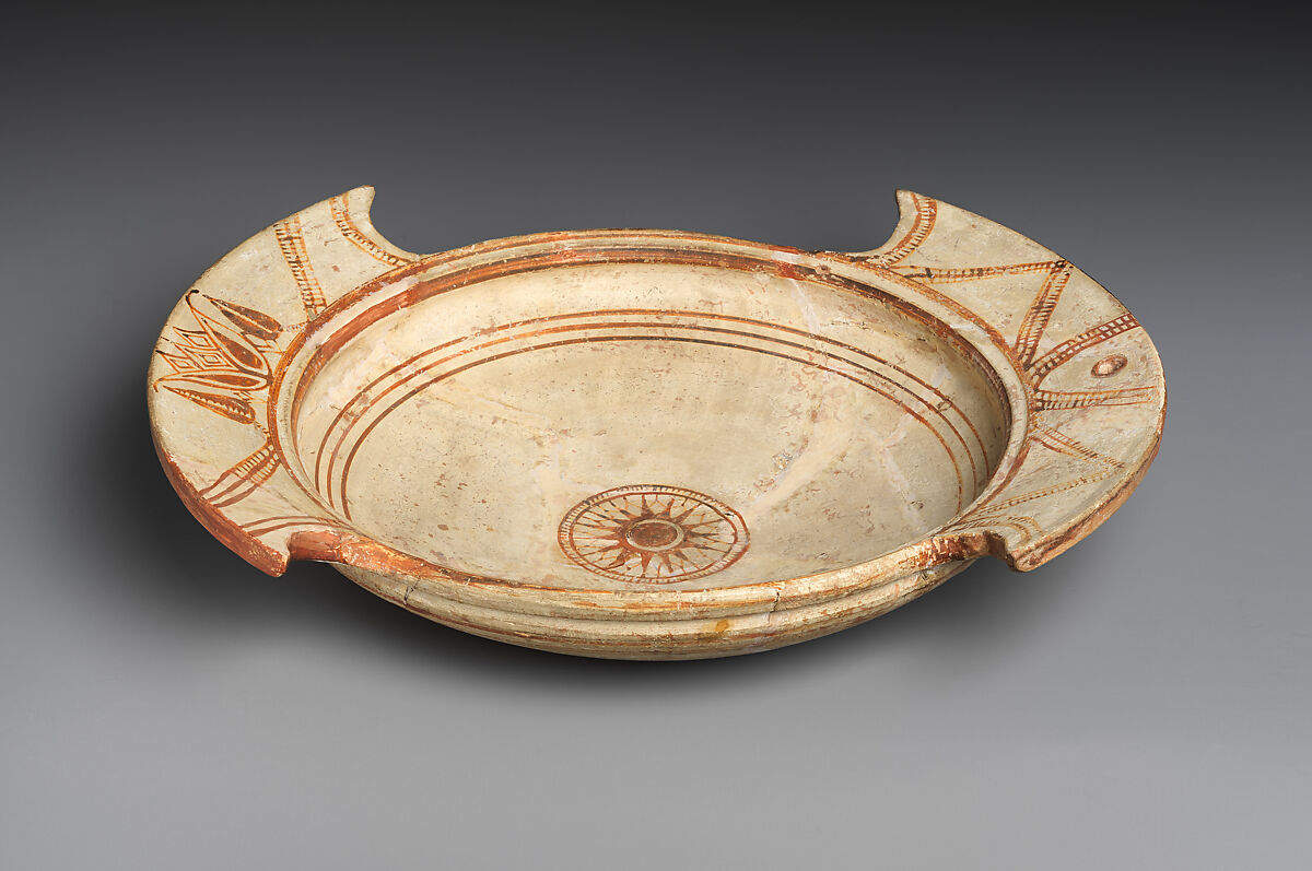 This plate, covered with white slip and decorated with delicate geometric and floral designs, imitates vessels made on Rhodes, Chios, and other Greek islands.