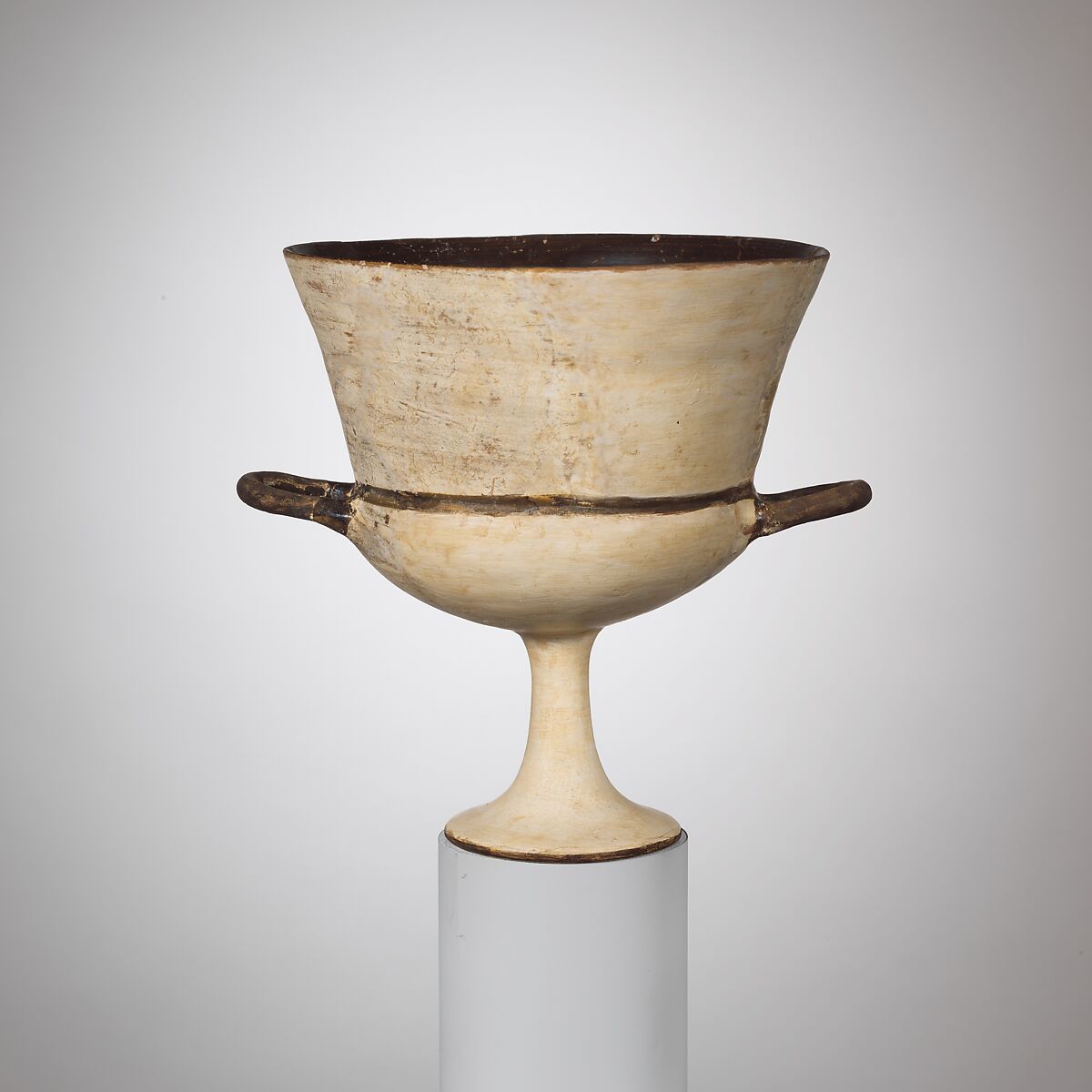 Much restored, this cup appears to be a Lydian imitation of a Chiot chalice. The latter is a vase with two vertical handles and a conical stem, normally covered with a white slip and often decorated with sparse ornament or figural motifs.