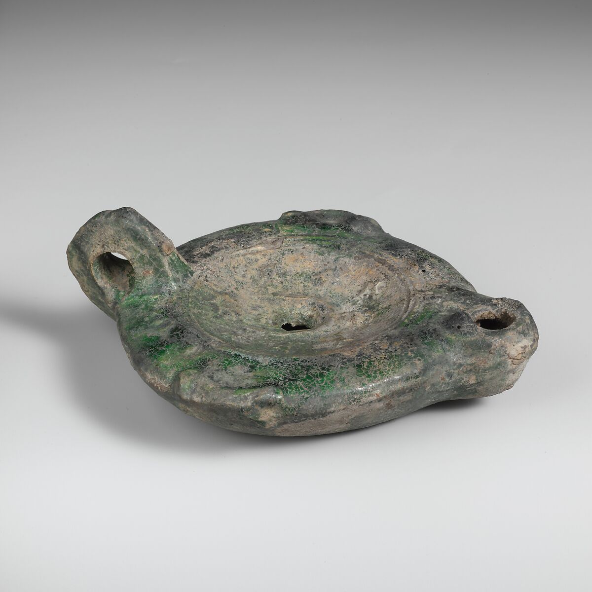 Green lead glaze; decorative lug handle on each side of the body; pierced ring-handle at rear.