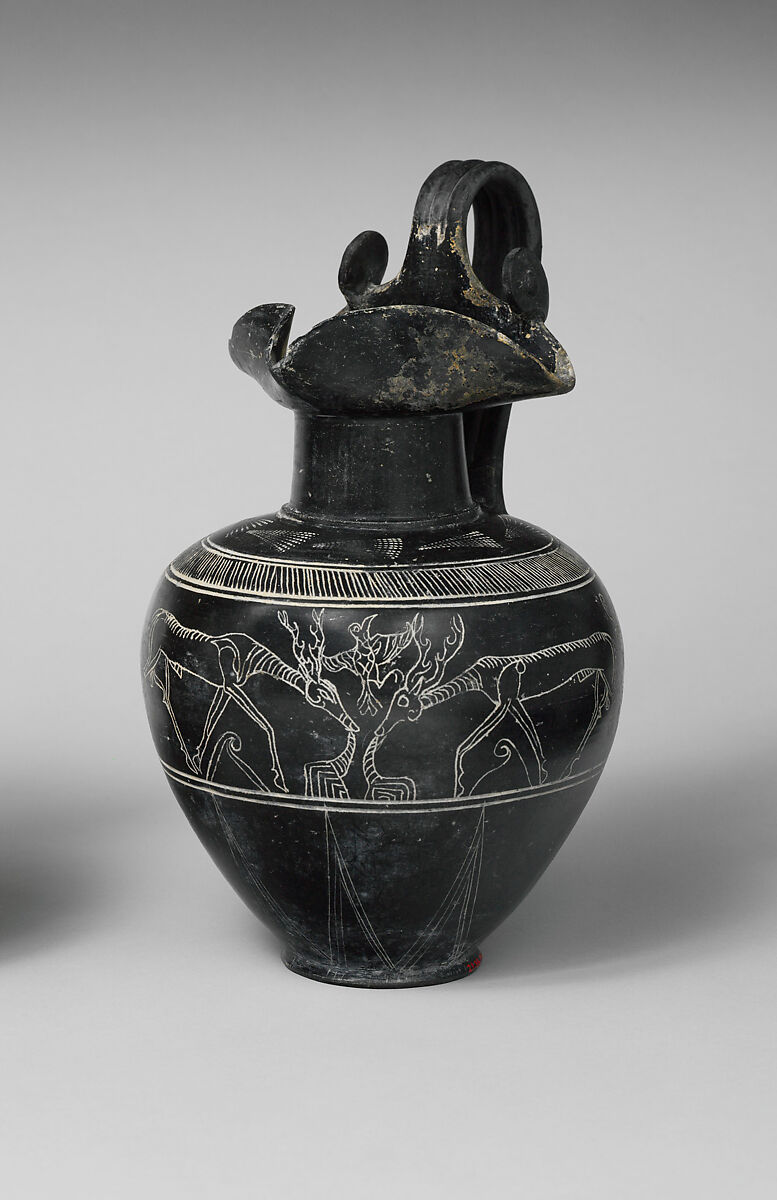 Both the shape and decoration of this bucchero sottile (light bucchero) jug are derived from Greek, especially Corinthian, prototypes.