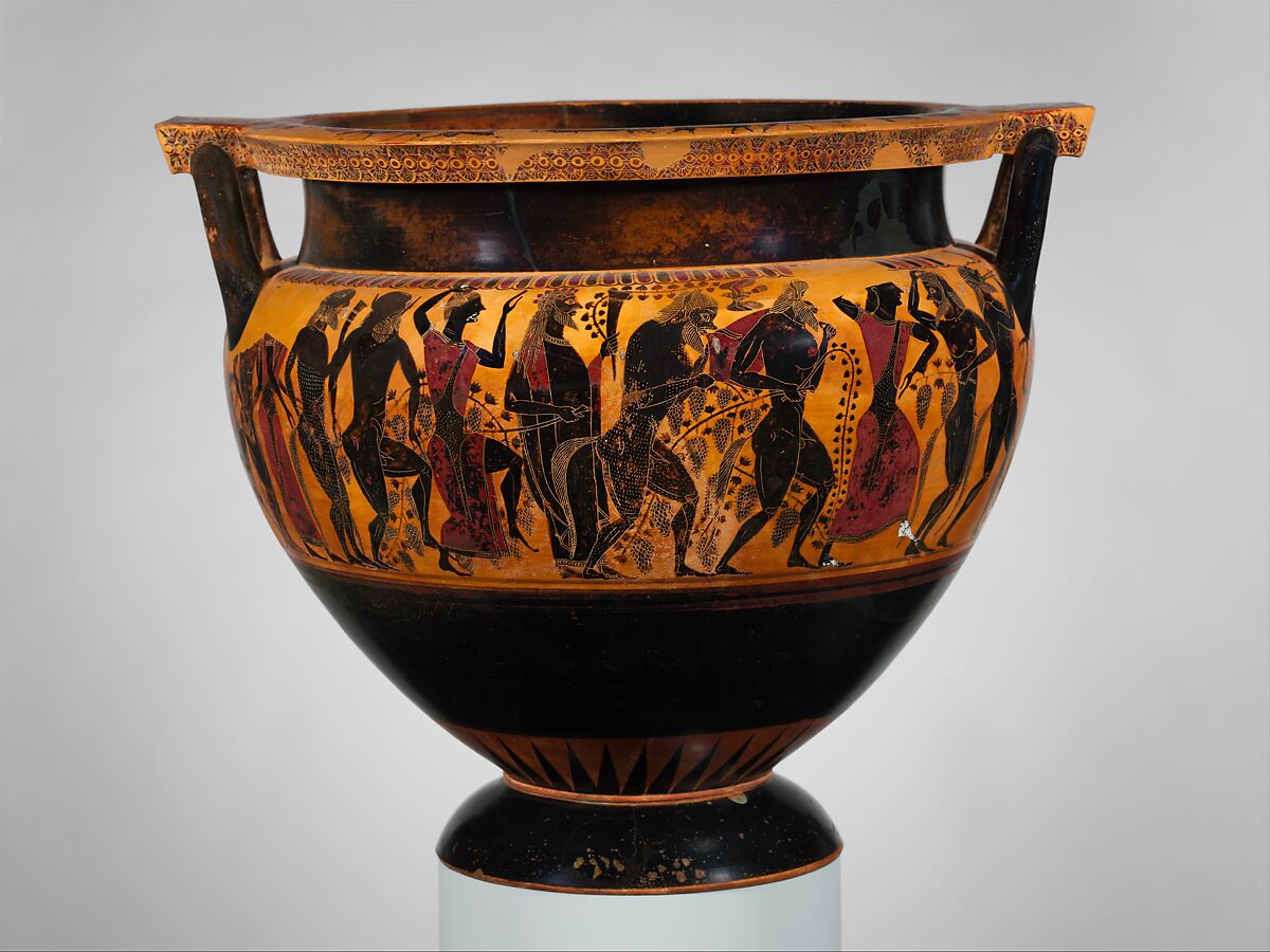 In black-figure vase-painting before the last quarter of the sixth century B.C., the decoration of large, elaborate kraters tended to be mythological. (On red-figure vases, the symposium itself was often depicted.) This krater is of exceptional significance because it is one of the first on which wine, women, and song are presented, albeit in a mythological guise.