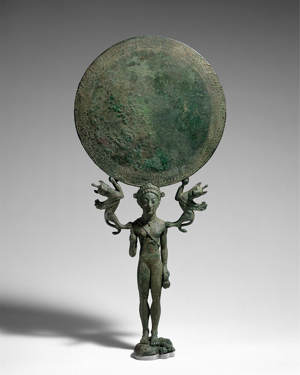 The girl stands on a curled-up lion, and griffins springing from her shoulders help support the mirror disk. She holds a pomegranate in her left hand and is nude except for a necklace and a strap from which hang a crescent-shaped amulet and a ring. Her nudity and the animals that surround her bring to mind images of the Mistress of Animals, an ancient Near Eastern deity who contributed characteristics to two Olympian goddesses, Aphrodite and Artemis. As a mirror handle, the figure may simply evoke the powers of Aphrodite, goddess of love and beauty; alternatively, she might be connected with Artemis Orthia, whose cult was important at the Laconian city of Sparta.