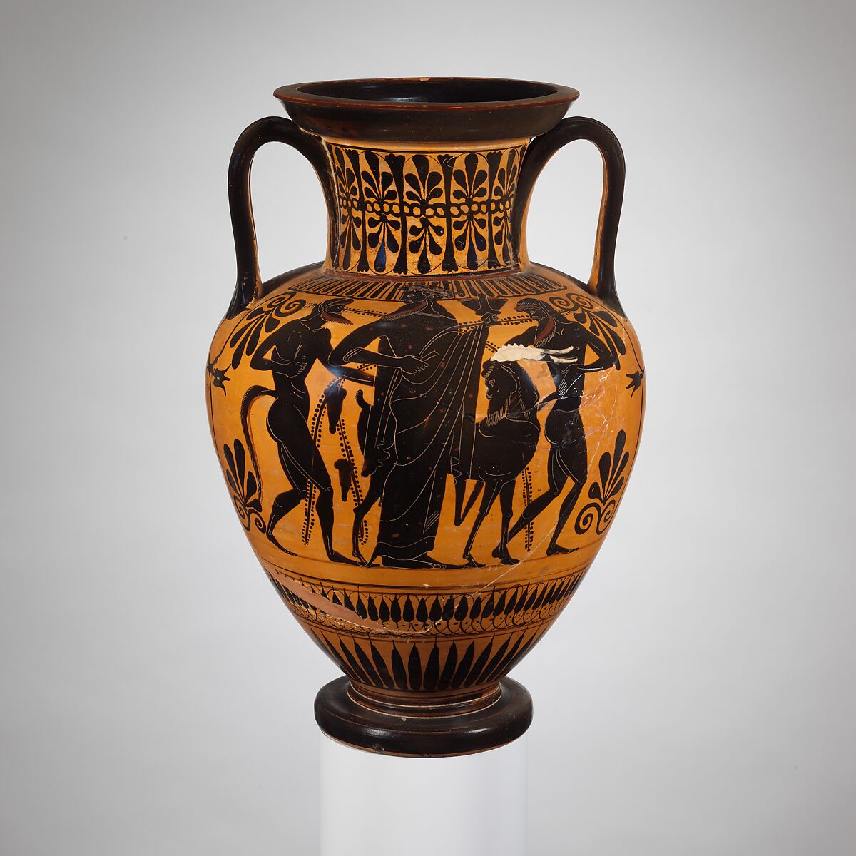 The male figure on the obverse has been interpreted as Perseus, the women as possibly daughters of the sea god Nereus. The representation on the reverse is most interesting for the goat that has a satyr-like face. Such creatures indicate that Dionysos was not only the god of wine but that he also had powers over various kinds of human and animal life.