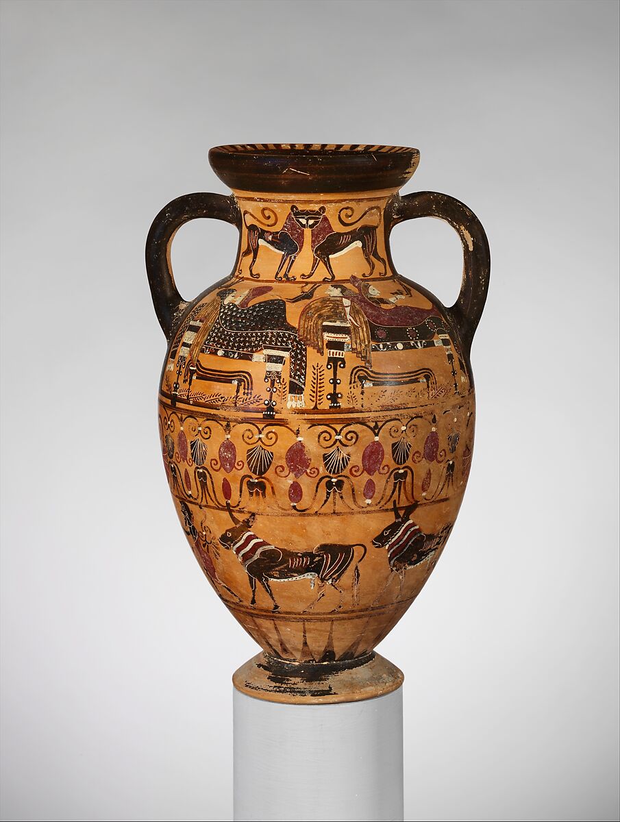 Pontic ware is a prominent style of early Etruscan black-figure pottery perhaps produced in Southern Etruria and strongly influenced by East Greek art. This amphora, by the most important painter of the group, is typical for its complex narrative design of multiple friezes rich in ornament and added colors.