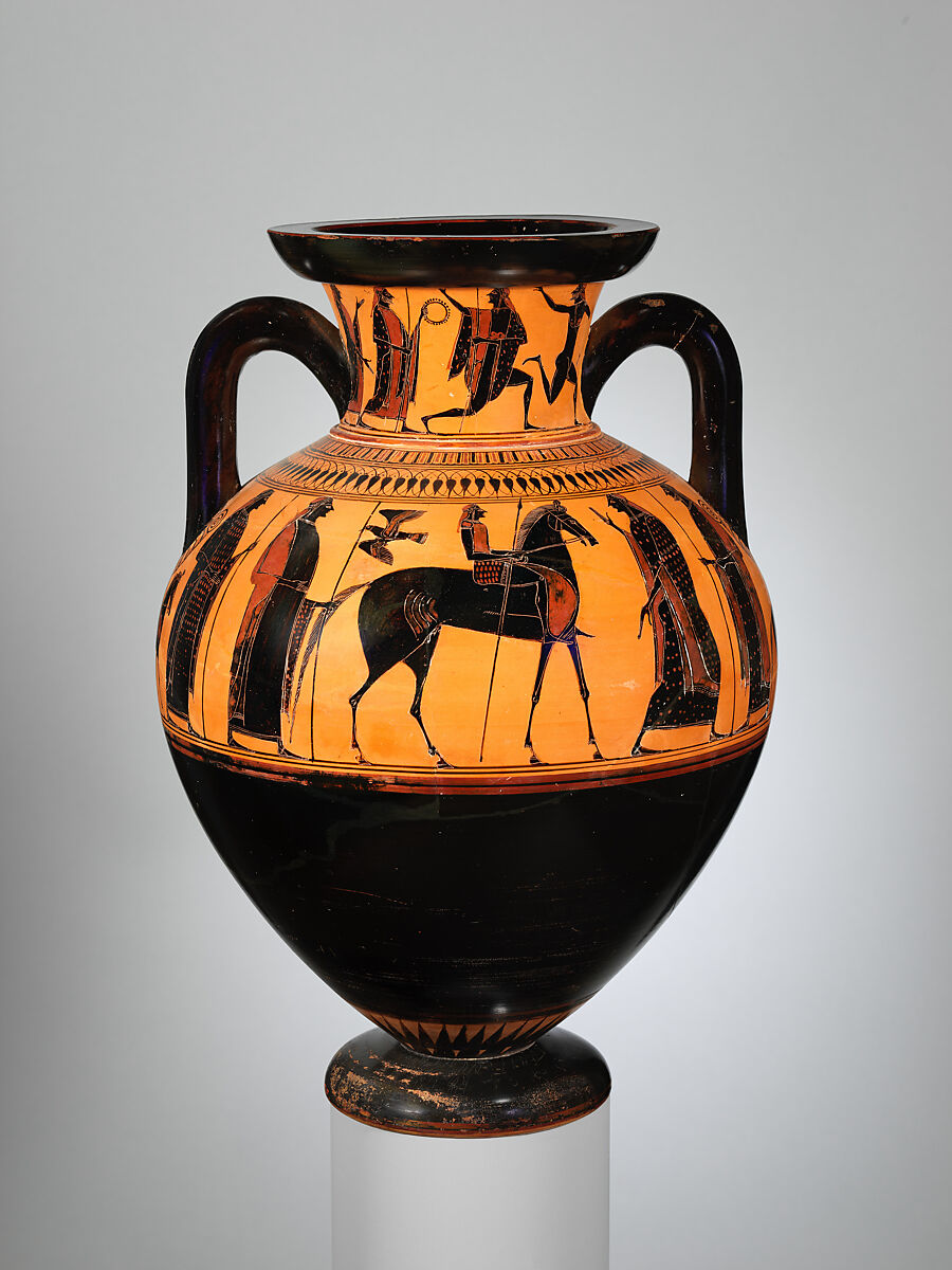 Obverse and reverse, on the shoulder, horseman setting out; on the neck, men pursuing youths; under each handle, Pegasos, the mythical winged horse