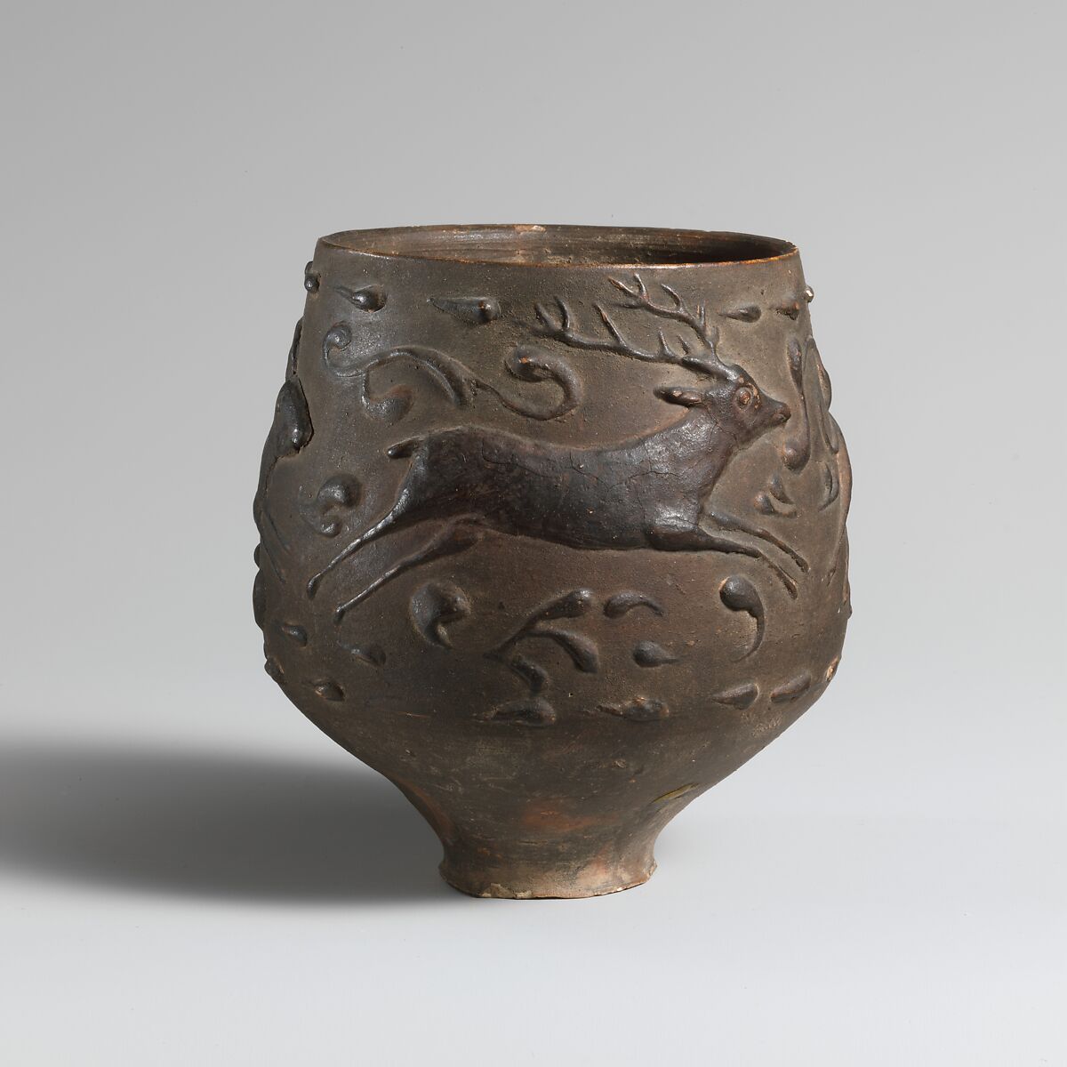 This cup is representative of the sort of pottery that was produced in Roman Britain, influenced by wares made in eastern Gaul and the Rhineland. The shape of the vessel and the style of the hunting scene are typical of the northwestern provinces, but barbotine decoration itself—the application of a thick clay slip to the vessel surface—is found on many different types of pottery across the Roman Empire.