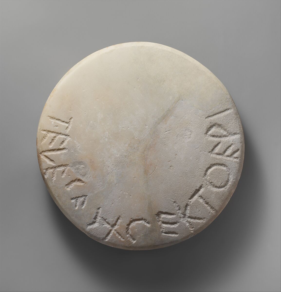 This diskos is one of a pair that were dedicated and later discovered still together; the mate is now in the Museum of Fine Arts, Boston. The inscription on this example identifies the owner as Telesarchos and adds from the tomb.