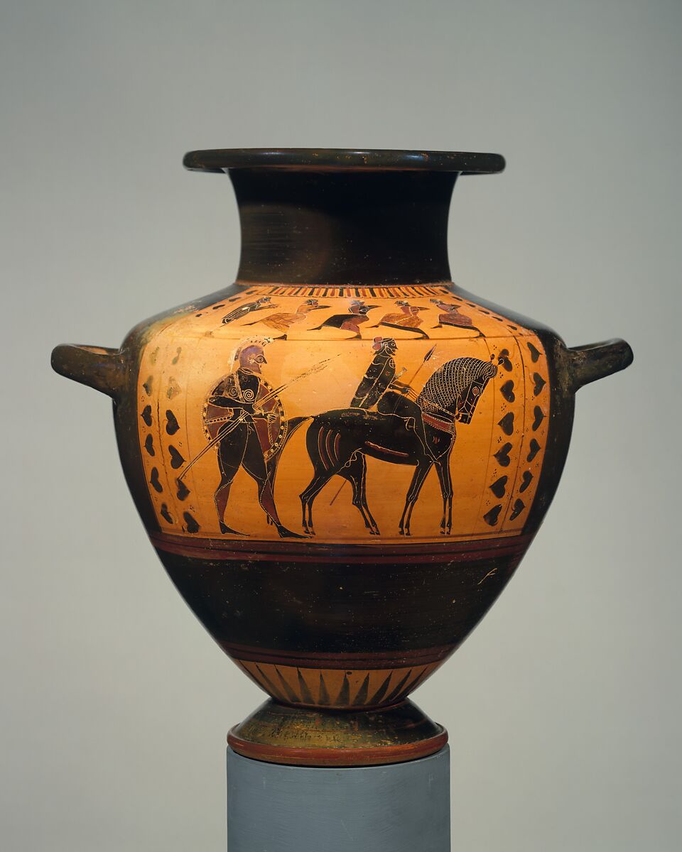 This vase contributes to our knowledge of the earliest theatrical performances. The figures can be identified by their garments and particularly by the animal ears tucked into their headbands. With the assistance of contemporary representations, it is possible to relate the chorus to performances that took place before the main theatrical event.
