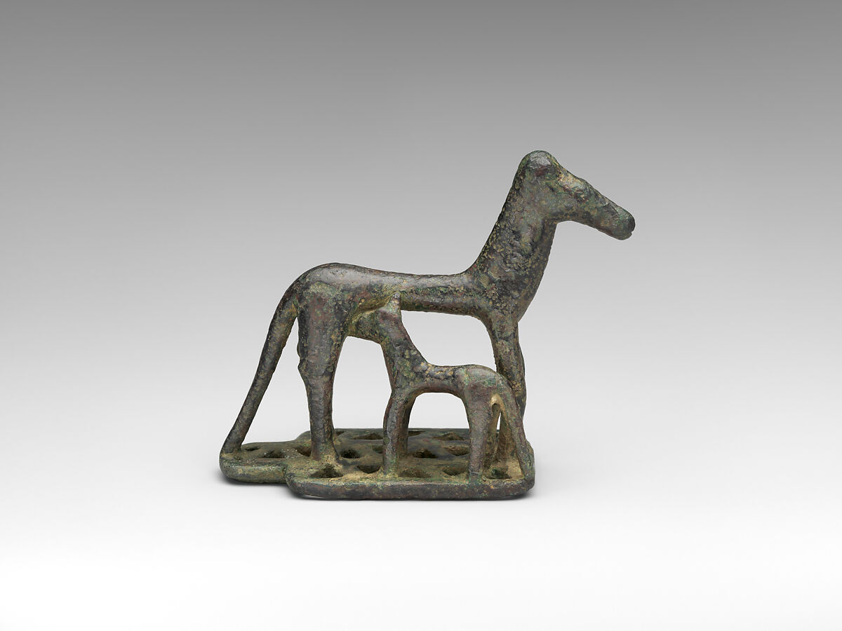 Here, a mare is nursing her foal in a less austere manner when compared to other artworks of the period. The body parts are cylindrical and rubbery with minimal articulation. The figurines are fixed on a rectangular plinth with three rows of triangles pierced straight through. Aesthetically, this elongated base significantly influences the three-dimensional effect of the piece. Such bases with openwork (perhaps used as stamps) appeared after the middle of the 8th century BCE and disappeared towards the end of the Geometric period.