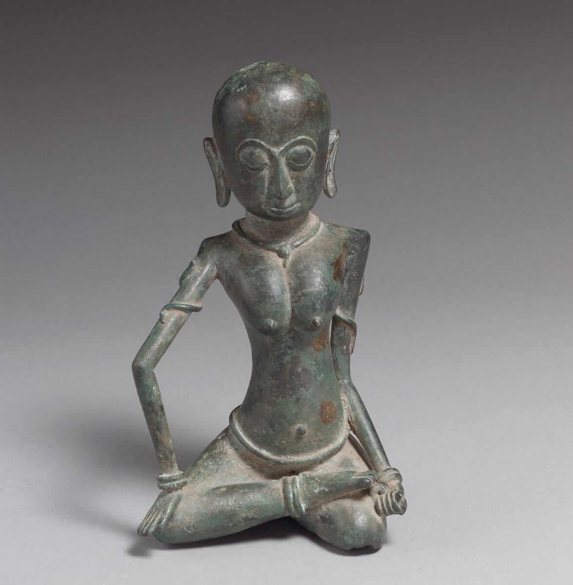 Small bronze sculptures of women and children were produced in some number during the Majapahit period. The function of these objects remains unclear. They may have been used as dolls, or as substitutes for certain individuals in magical rituals or other ceremonies. Her thin arms and shaved head suggest that this figure may represent an ascetic. She is seated with left leg folded beneath her, and wears a sarong, serpentine armlets, and a necklace with leaf-shaped pendants and bands around her wrists and ankles. She has a serene expression, heavy-lidded downcast eyes, and prominent arched eyebrows.