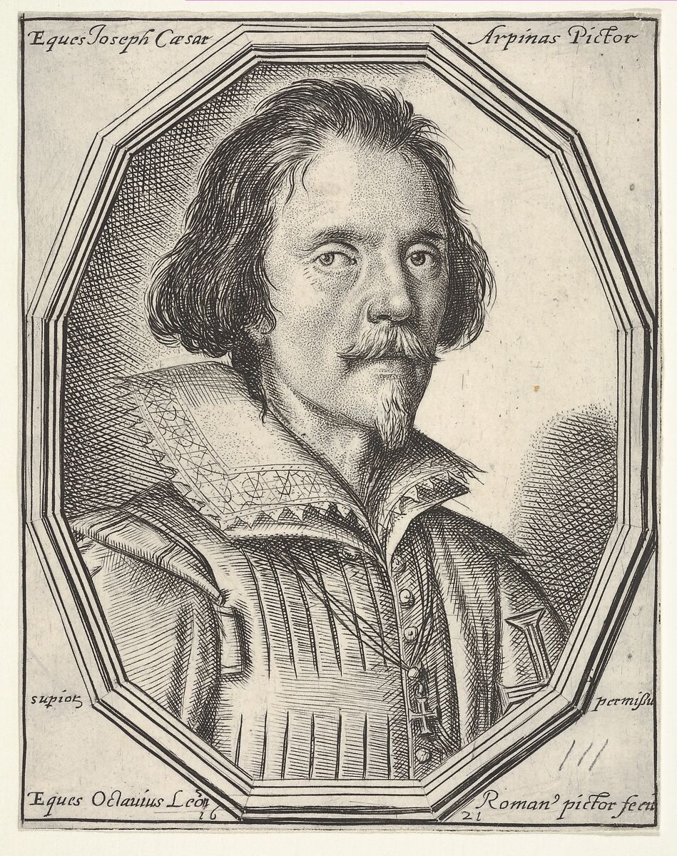 Late in life, from around 1621 until 1630, Leoni made forty striking portraits of famous men, including this depiction of the Roman artist Cavaliere d’Arpino (1568–1640). The frames around Leoni’s portraits indicate the occupation of the sitter: popes and cardinals have a square format, writers have oval frames, and artists have dodecagonal ones. It is possible that despite their similarities, Leoni’s portrait prints were not intended as a series as such, but simply reflect the fact that he kept working within a preferred visual format over a long period of time.