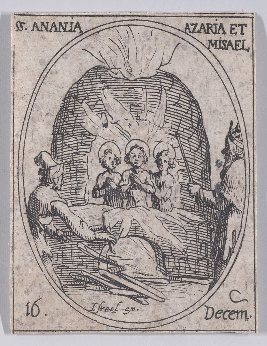 - Title: S. Ananie, S. Azarie et S. Misaël (St. Ananias, St. Azarius, and St. Misael), December 16th, from "Les Images De Tous Les Saincts et Saintes de L'Année" (Images of All of the Saints and Religious Events of the Year)