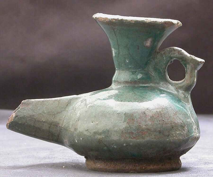 This heavily potted lamp contains a closed reservoir that would have held burning oil and a wick. Soaked in the oil and lighted, the wick would transport the fuel to the flame. Similar ceramic lamps were common in Egypt in the thirteenth to fourteenth century, together with other examples in which the reservoir is placed on a stem.