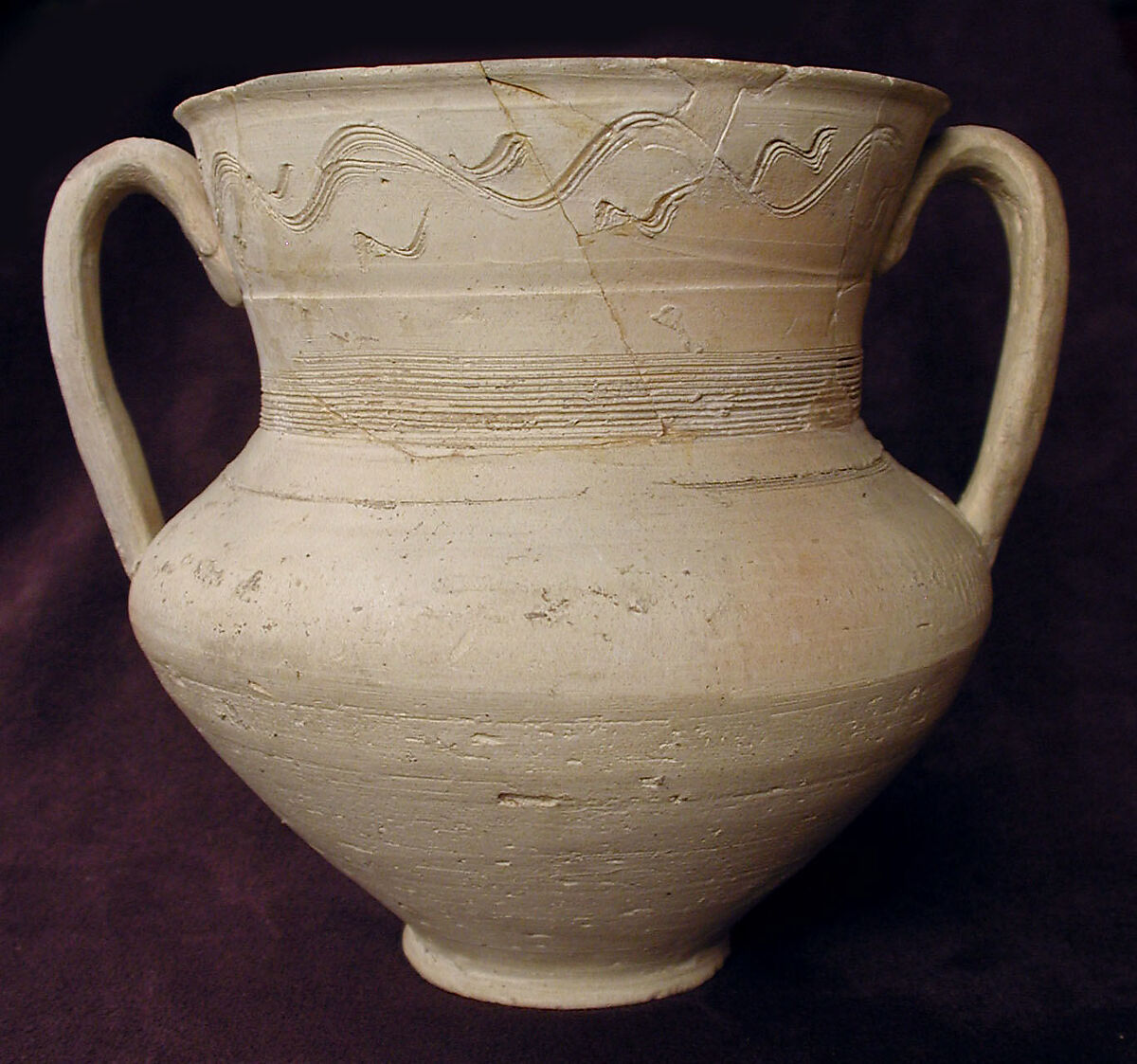 The form of this piece closely reflects its function as a drinking vessel. Its wide, flaring mouth and porous body fabric allow water to stay cool by evaporation and its large, ear-like handles make lifting and tipping easy. Even the simple decoration near its lip – a wave-like line incised into the clay – readily brings the vessel’s intended liquid contents to mind.