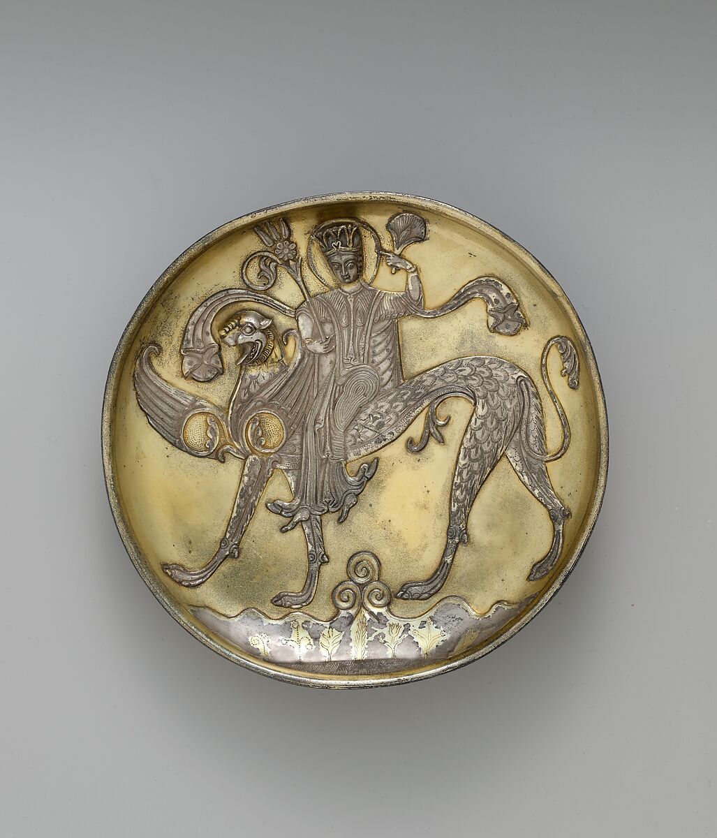 Like Sasanian examples, this plate depicts a female figure riding a fantastic winged beast with a feline head, feathered body, and canine legs. Her figure is unnaturalistically twisted, a quality seen on late seventh‑ and early eighth‑century Central Asian wall paintings from Panjikent. The lower part of the plate contains a symbolic representation of earth, water, and sky.