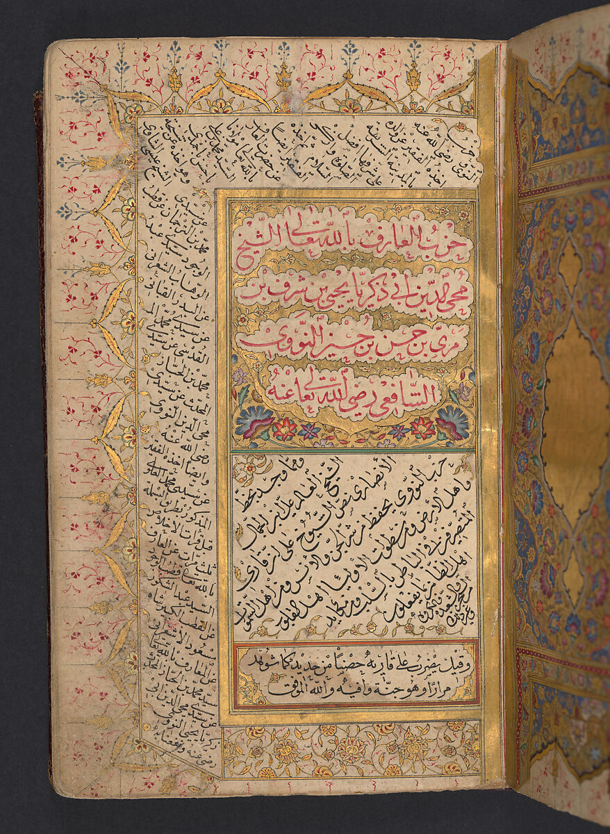 This portable prayer book has all the qualities of a royal manuscript. The striking maroon binding has a border and central medallion tooled in gold protecting this delicate manuscript. The first folio is a spectacular gold-speckled burnished paper. The text hails the religious authority of al-Nawawi, the author, and informs the reader that the prayers contained within will protect him from the evils of supernatural beings (jinn) and humanity. The gold ink decorates the borders of the folios filled with vegetal and geometric motifs.