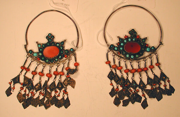 These delicate earrings were most likely produced in Khiva, in modern-day Uzbekistan. The use of carnelian and turquoise is typical of jeweled objects from Central Asia, and these gemstones were believed to provide courage and protection.