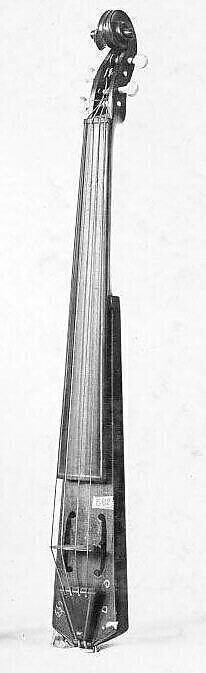 Description: Narrow, tapering case, the back formed of five strips of wood, inlaid with black and white lines. C sound-holes. Tail-piece and finger-board of ebony, inlaid with light lines. Head terminating in a scroll, with four ivory pegs.