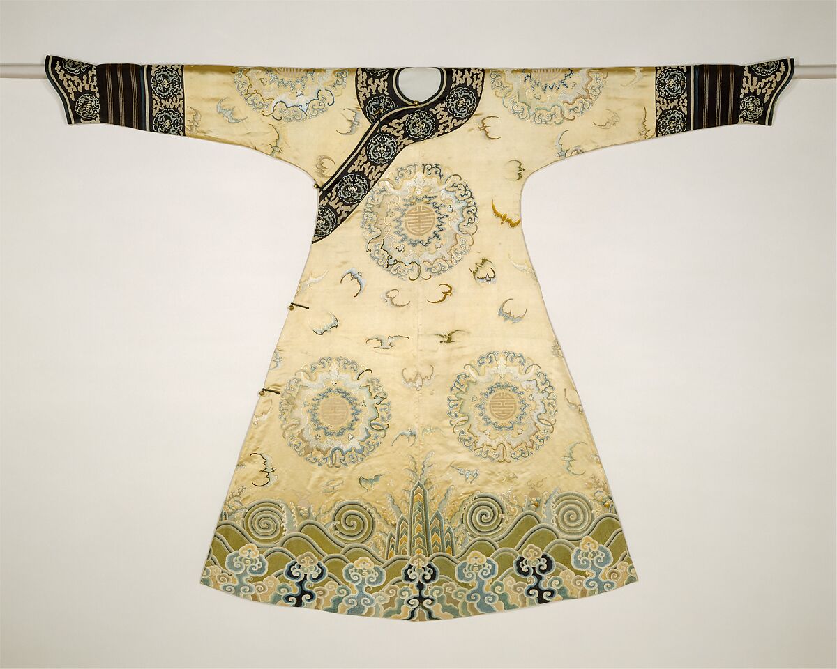 In Chinese, the word for “bat” (fu 蝠) sounds like the one for “happiness” (fu 福), so this robe carries a symbolic message of good fortune. The roundels of five interlocking bats surrounding the Chinese character for “longevity” (shou 壽) refer to the “Five Happinesses”: longevity, health, wealth, virtue, and a natural death.